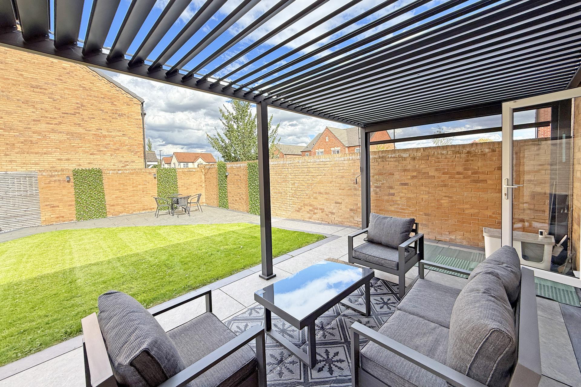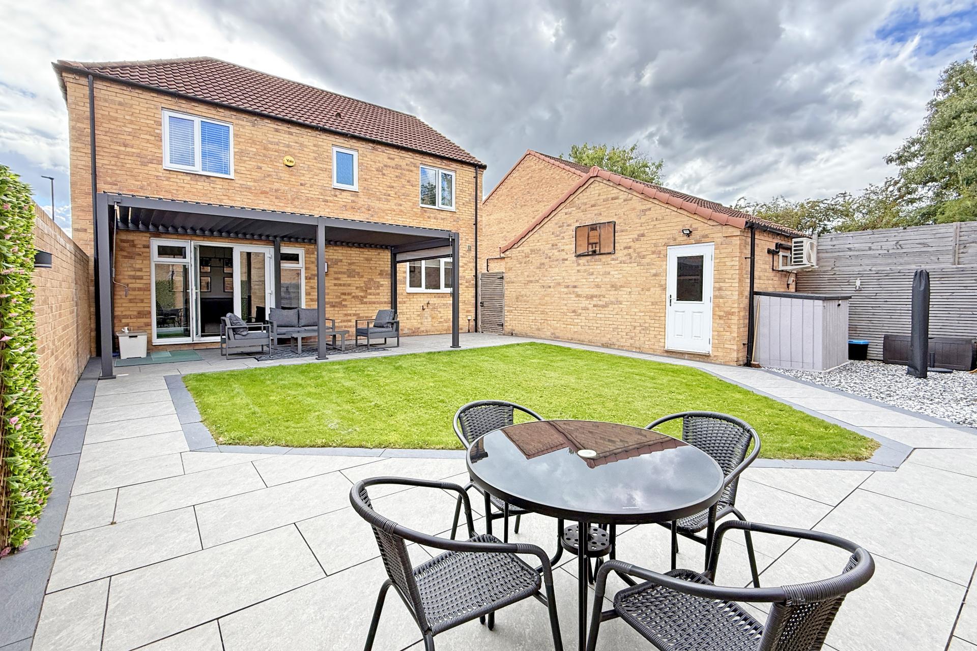 OUTSIDE The property occupies a generous plot with attractive landscaped gardens to the rear including lawn and paved sitting areas, and a superb covered sitting area accessed from the dining kitchen. A driveway provides ample parking, with electric vehicle charge point and leads to a large garage which has been fully plastered out with electric door, air-conditioning, and loft storage above.