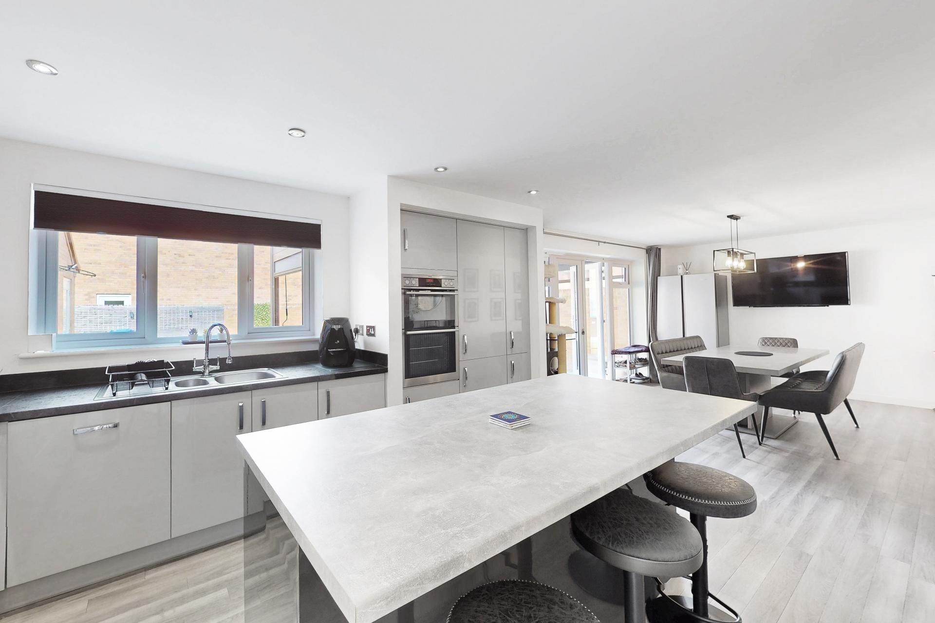 A stunning open-plan kitchen and living/dining area with glazed doors leading to the garden. The kitchen comprises a range of modern fitted units with worktop, island and breakfast bar. Integrated appliances include gas hob, double oven, fridge / freezer and dishwasher.