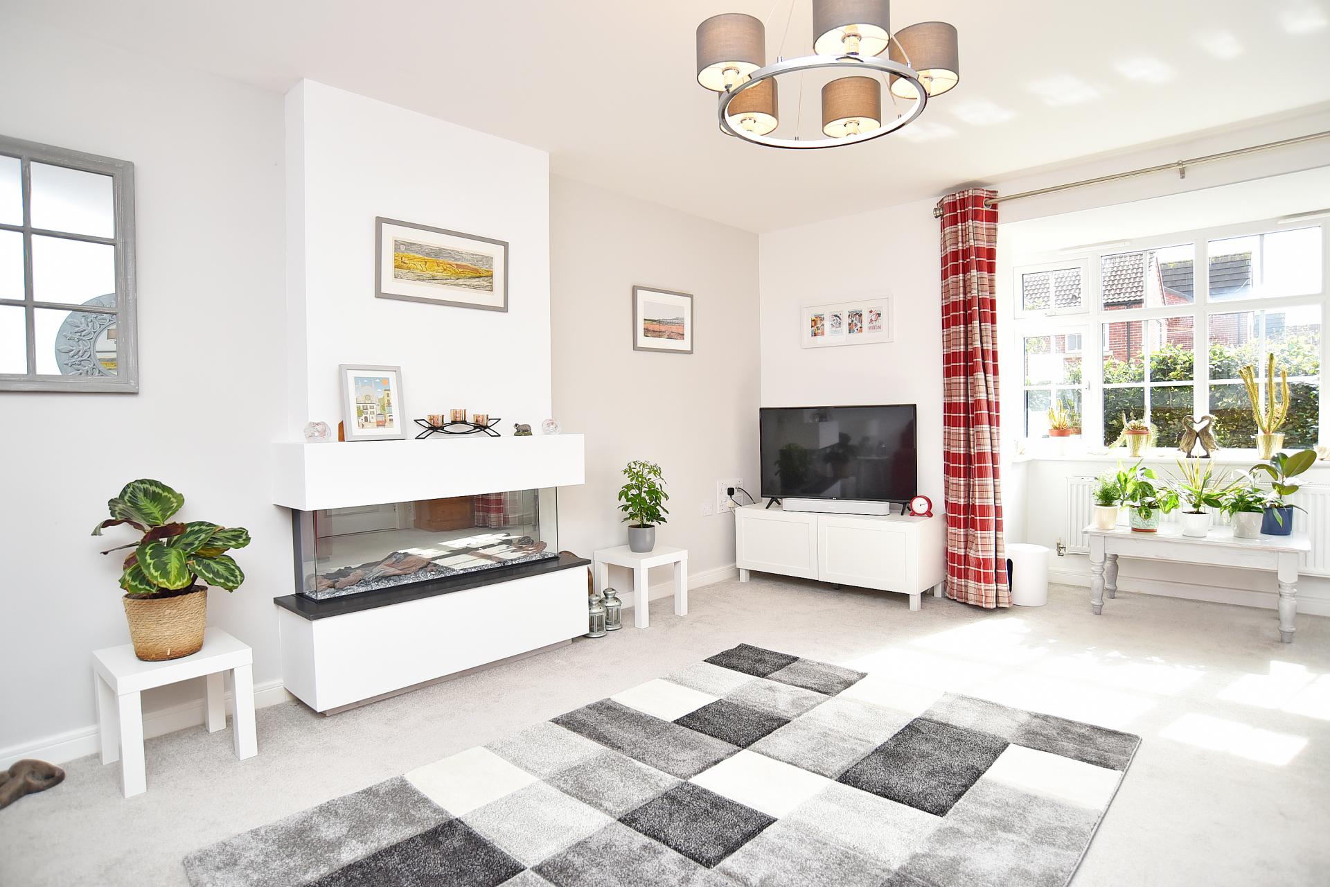 A large reception room with bay window to the front and contemporary electric fire.
