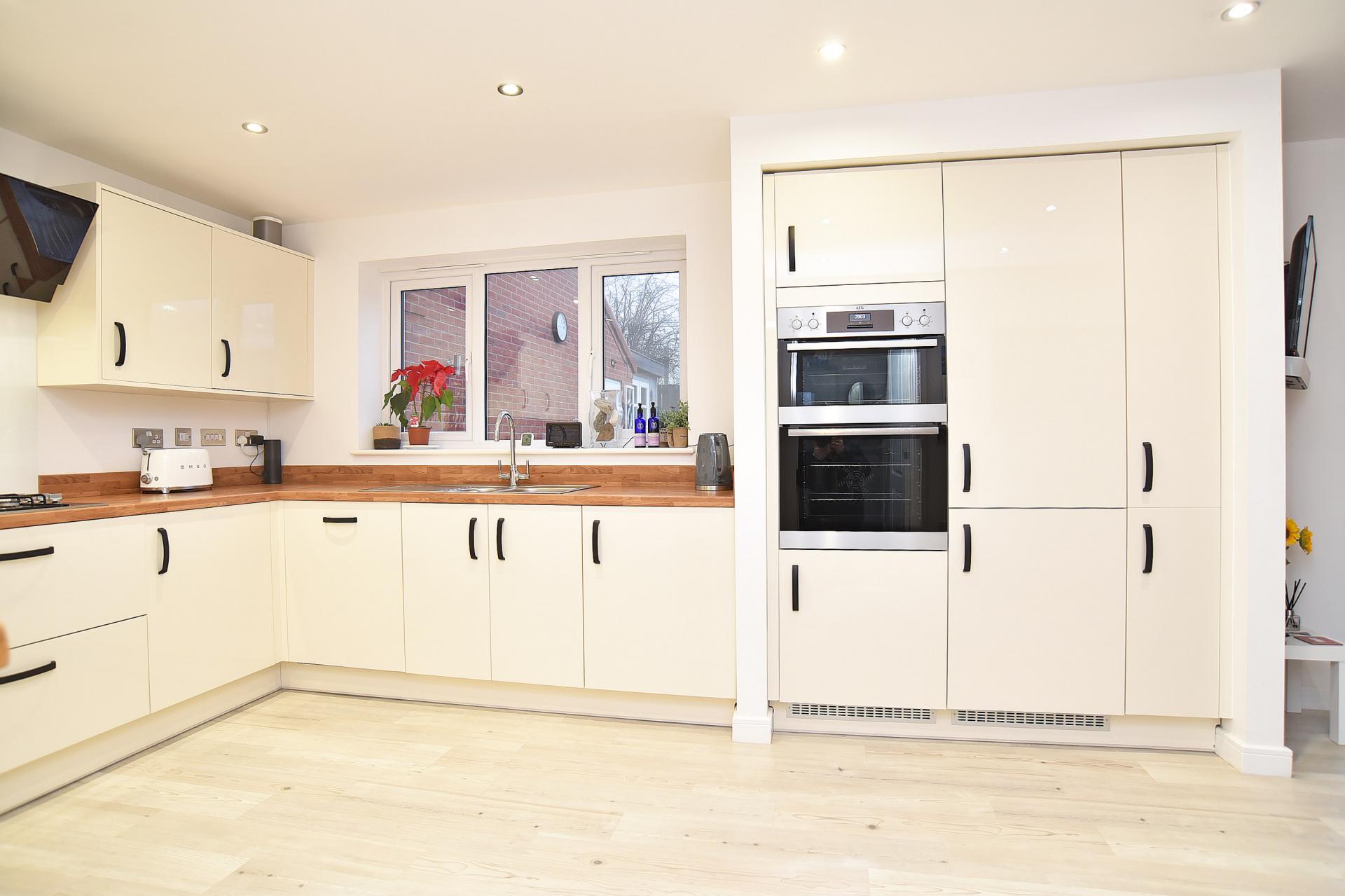 A stunning open-plan kitchen and living/dining area with glazed doors leading to the garden. The kitchen comprises a range of modern fitted units with worktops and integrated appliances include gas hob, double oven, fridge / freezer and dishwasher.
