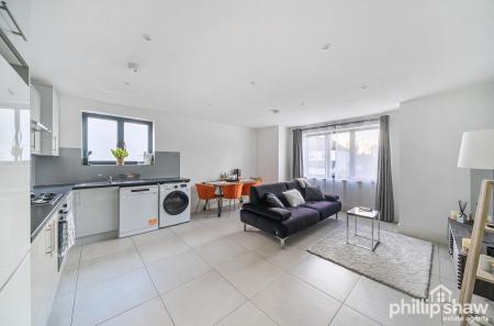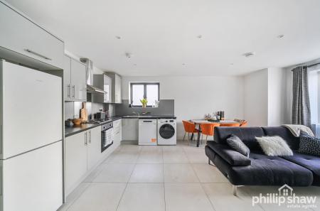 The property opens into a welcoming entrance hall leading through to a spacious open-plan kitchen and reception area, featuring an L-shaped fitted kitchen that neatly defines the living and dining space while retaining an open and sociable feel. Tiled flooring with underfloor heating runs throughout the apartment, enhancing the contemporary finish and ease of maintenance.