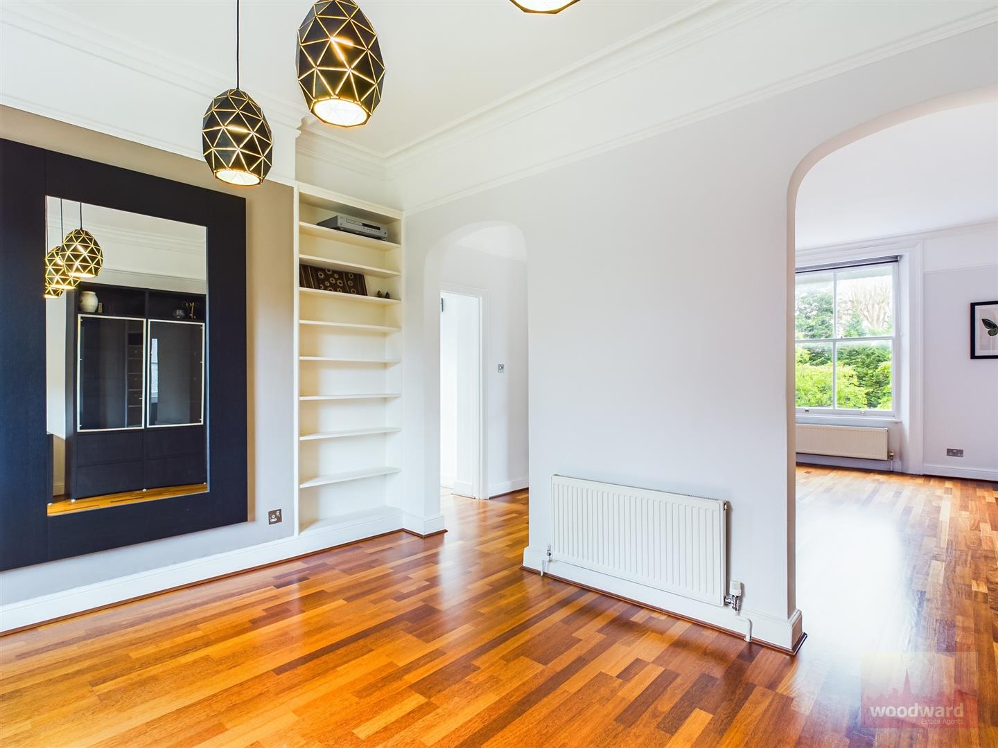 The apartment offers a flexible layout currently arranged as two bedrooms, two reception rooms and two bathrooms, with clear potential to create a third bedroom if desired. Ceiling heights approach ten feet, lending volume and a quiet grandeur to the principal rooms. Tall timber sash windows draw in excellent natural light, with double glazing fitted to the front elevation, while the main lounge centres around an open fireplace, reinforcing the building's period character.