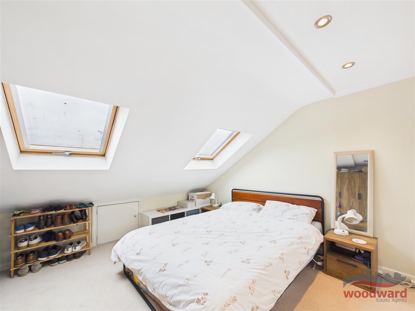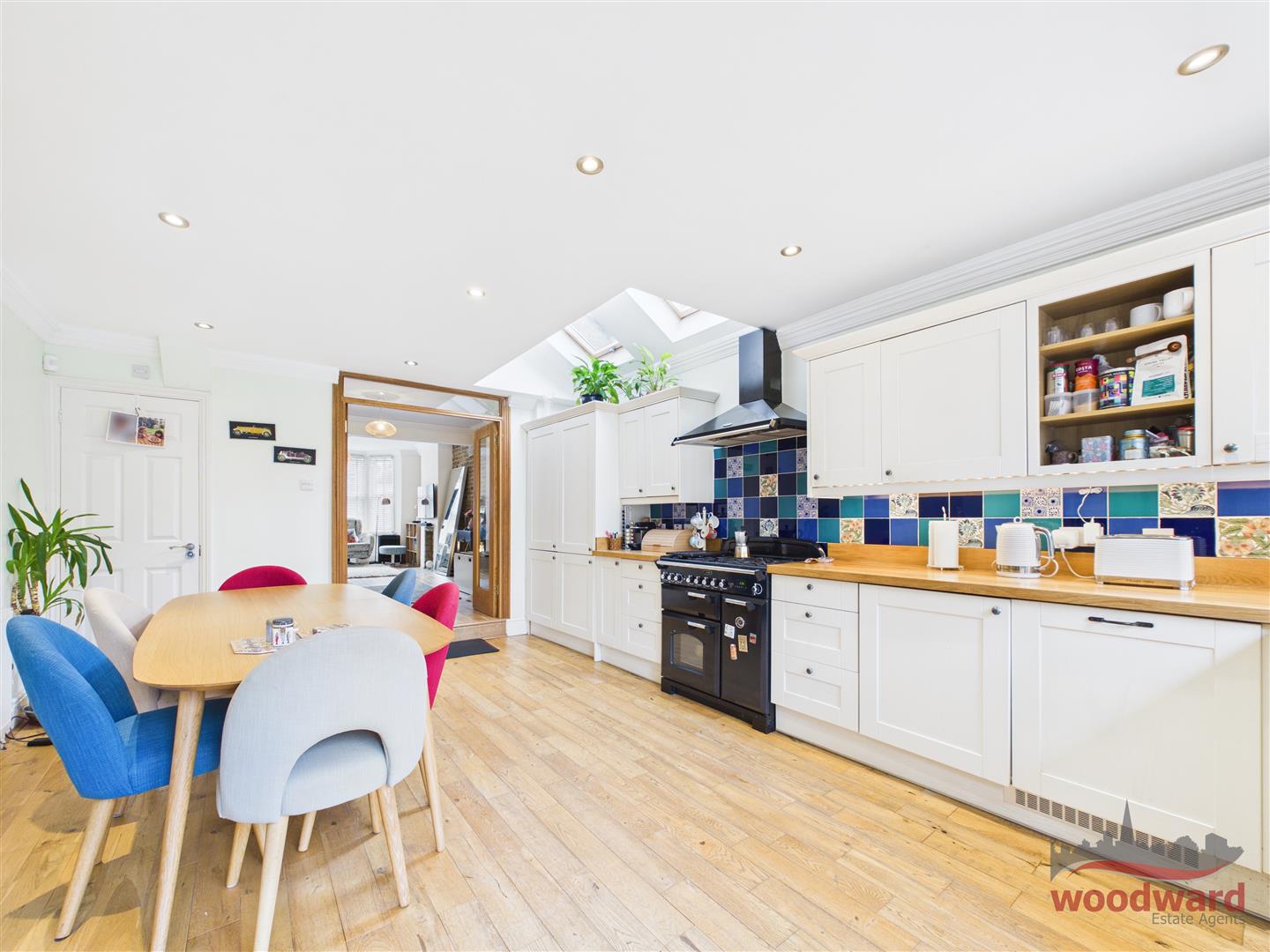 - Extended kitchen dining space flooded with natural light from skylights