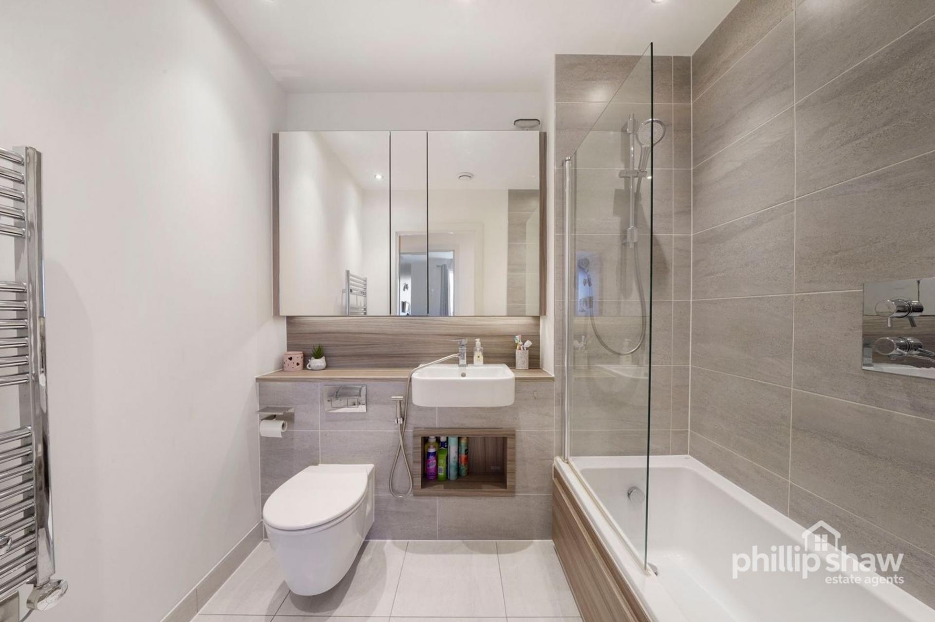 The master bedroom is a well-proportioned double and benefits from a sleek en-suite shower room. The second bedroom is also a comfortable double, ideal for guests, childs room or home office use. A contemporary family bathroom serves the second bedroom and visitors, finished with quality tiling and modern sanitaryware. Underfloor heating runs throughout, enhancing comfort and maintaining clean, uncluttered interiors.
