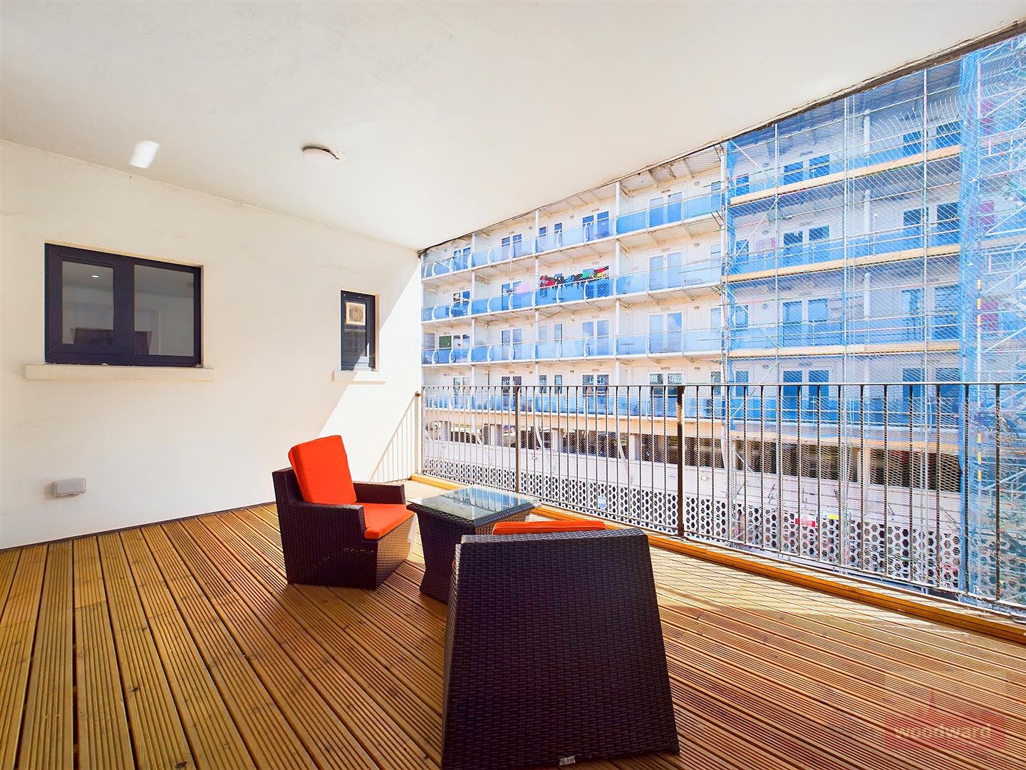 The apartment boasts high ceilings and double-glazed windows that flood the space with natural light. Both double bedrooms are generously sized and come with fitted storage, while the main bedroom features a stylish ensuite bathroom, a walk-in wardrobe, and direct access to the exceptionally large balcony, perfect for outdoor relaxation.