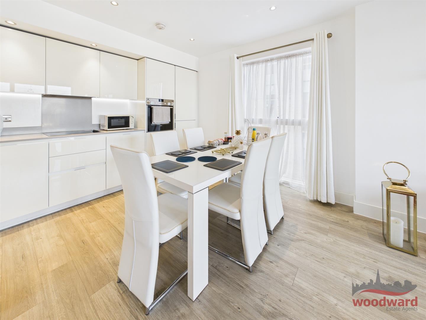 The bright and airy open-plan kitchen and living space is designed for modern living, featuring floor-to-ceiling windows that flood the room with natural light. The private balcony provides a perfect spot to unwind while enjoying impressive views across Harrow. The contemporary kitchen is well-equipped with integrated appliances, ample storage, and space for dining.