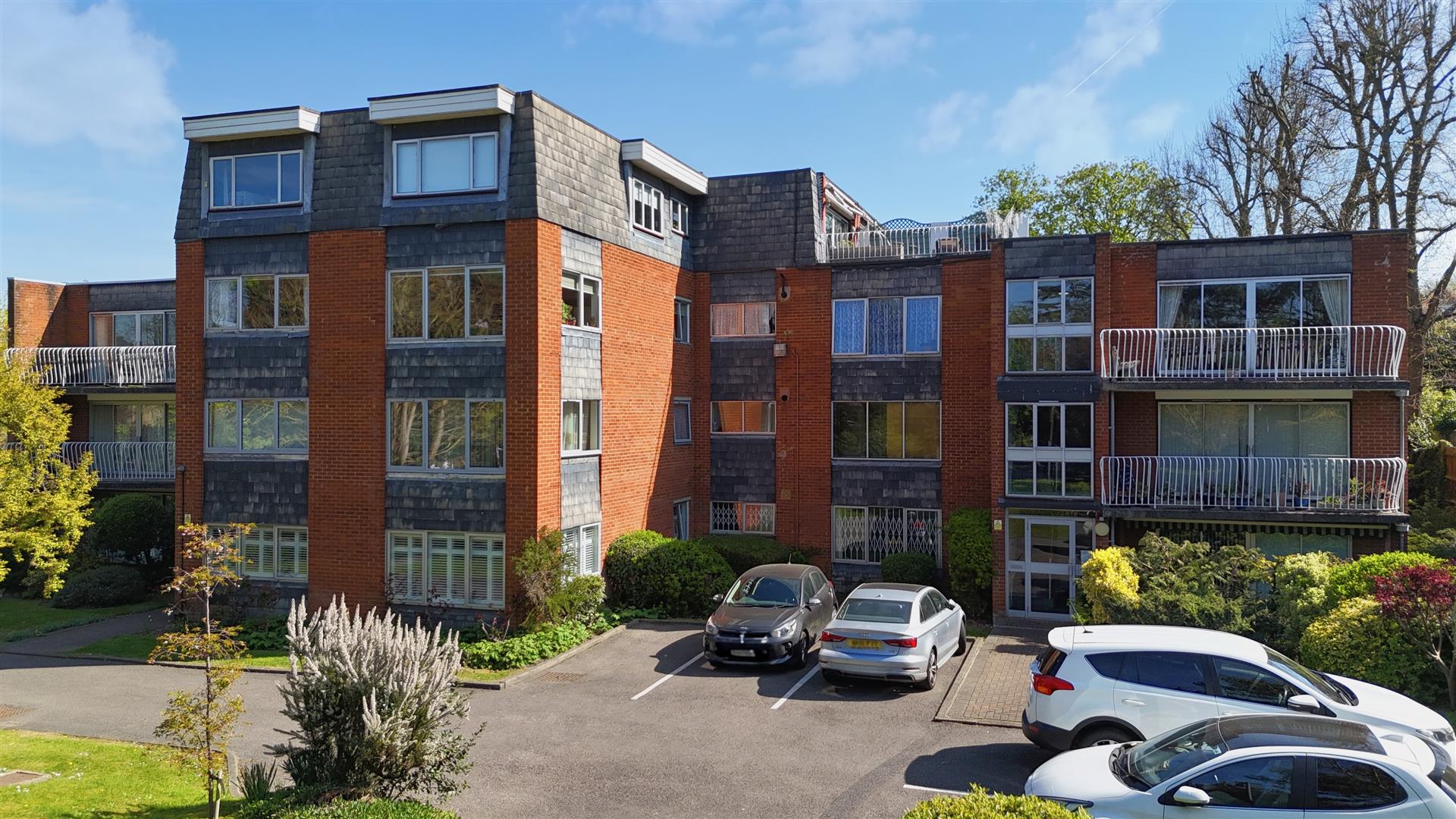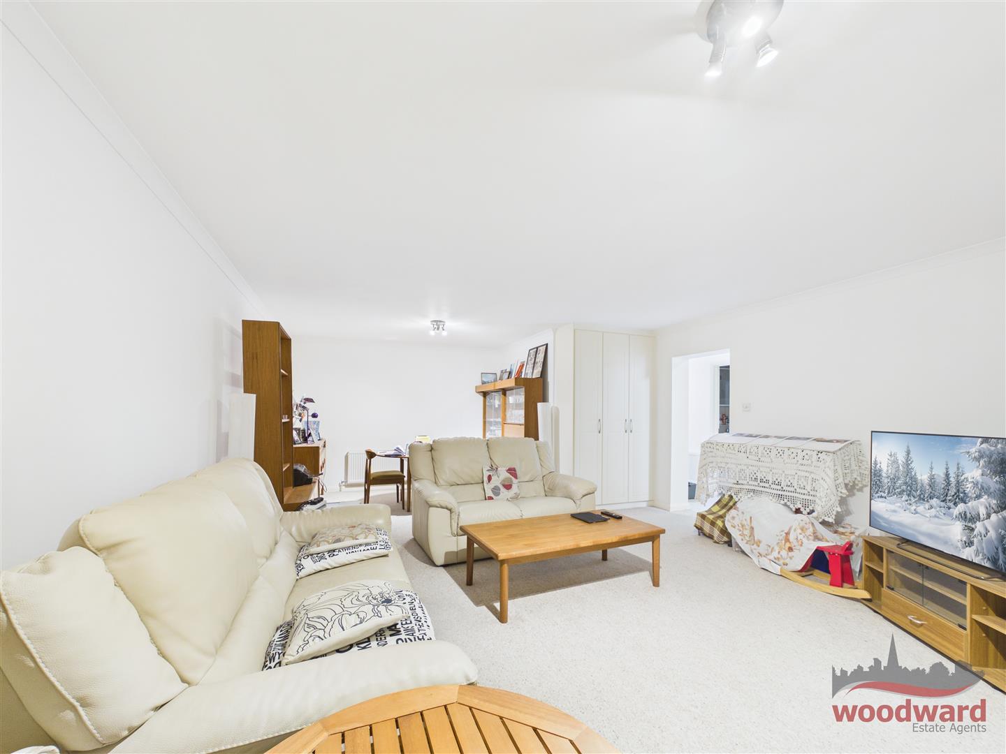 The apartment is entered via a wide hallway that immediately establishes the scale of the accommodation. The living room is notably large, comfortably accommodating both seating and dining areas, and opens onto a private balcony that looks across the communal gardens. This outlook brings a sense of calm and greenery, particularly welcome given the proximity to the town centre.