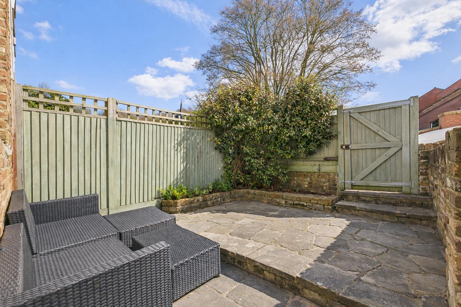 To the rear, a separate dining room leads through to a modern fully fitted kitchen and a calm, understated palette. From here, doors open onto a private garden, extending the living space outdoors and offering a peaceful setting with direct access to the Church Fields. The outlook is particularly special, with views towards the spire of St Mary's Church rising above the surrounding greenery.