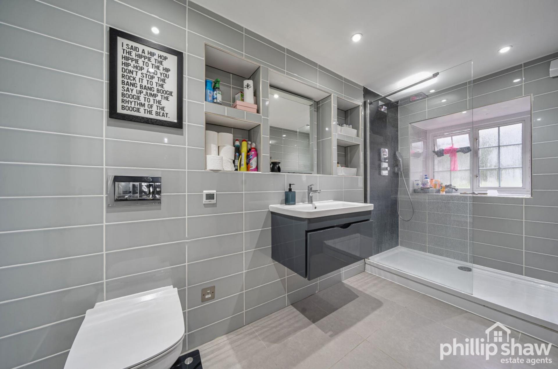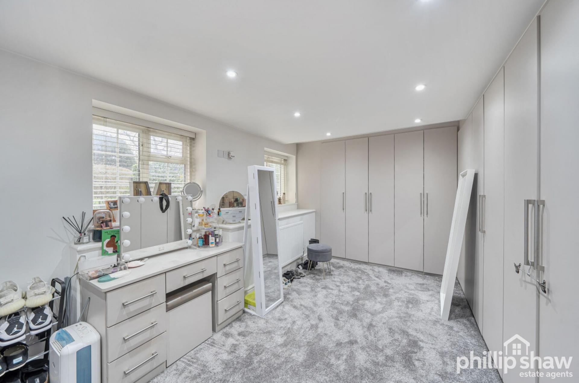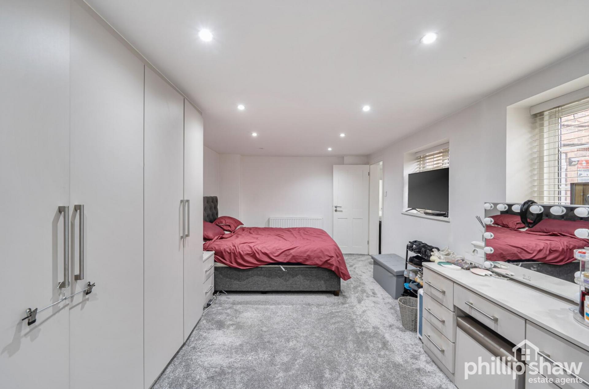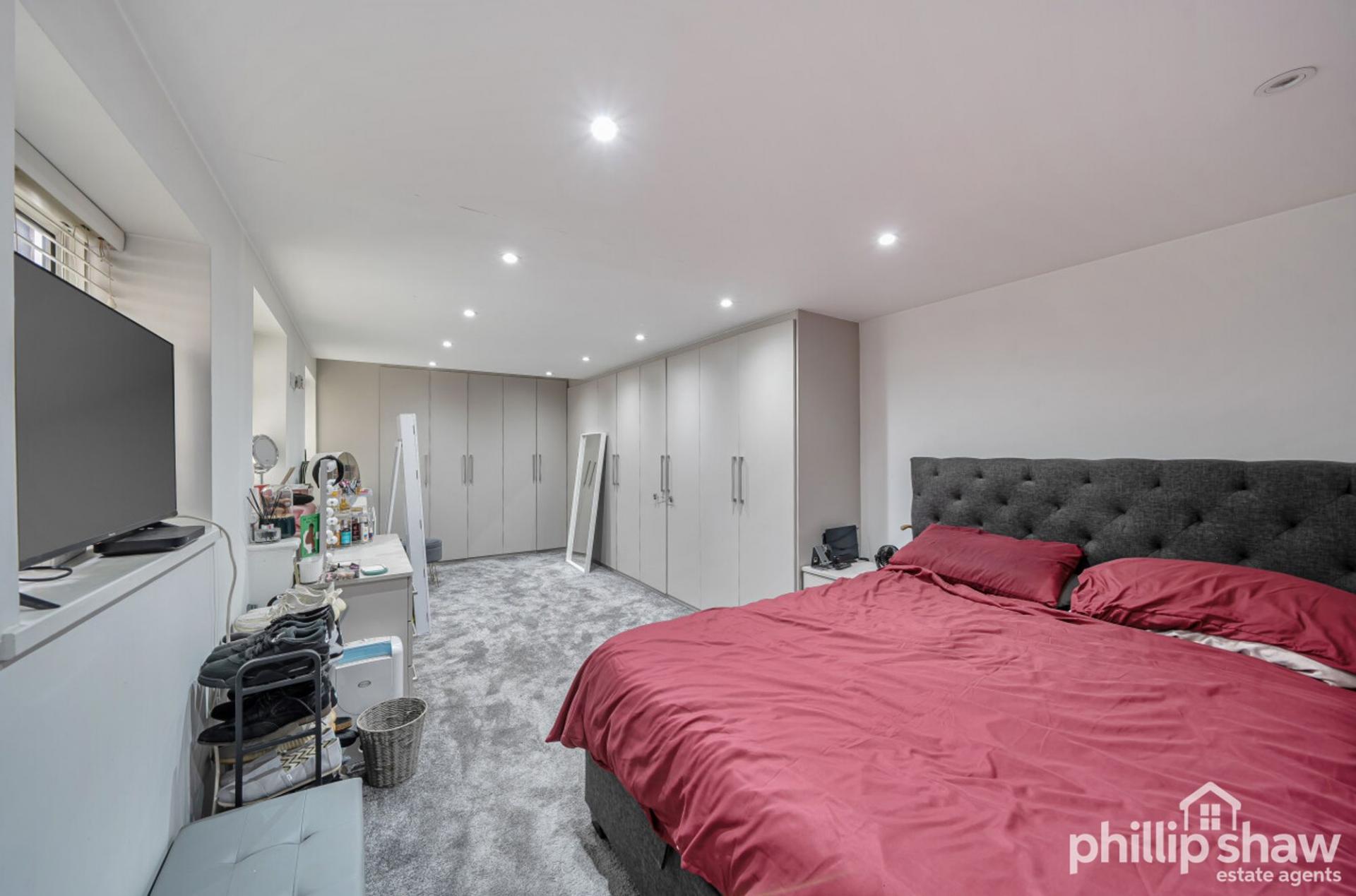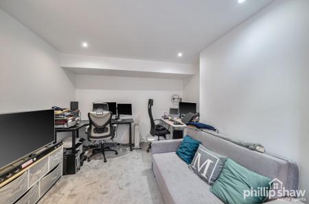The principal bedroom is particularly well proportioned and features extensive fitted storage, while the second bedroom provides flexibility for guests, a home office or additional family space. A modern bathroom with underfloor heating serves the property, complemented by a useful utility area and additional storage room, enhancing practicality and organisation.