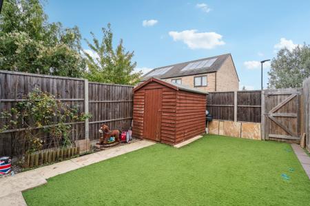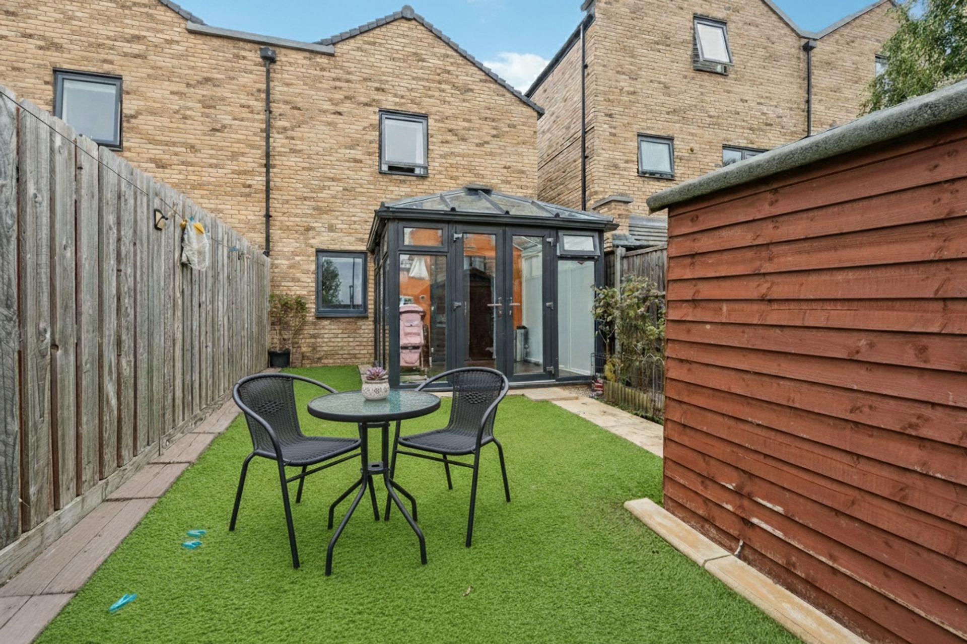 - Low-maintenance garden with artificial lawn and shed