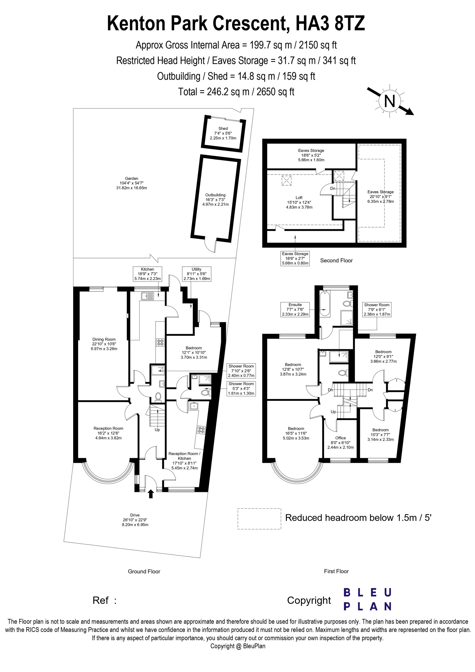 The first floor offers five bedrooms, including a master bedroom with walk in wardrobe & en suite, four further additional good sized room (one being used as an office), and a family shower room with WC. A further loft room on the second floor provides excellent additional space, with the benefit of generous eaves storage.