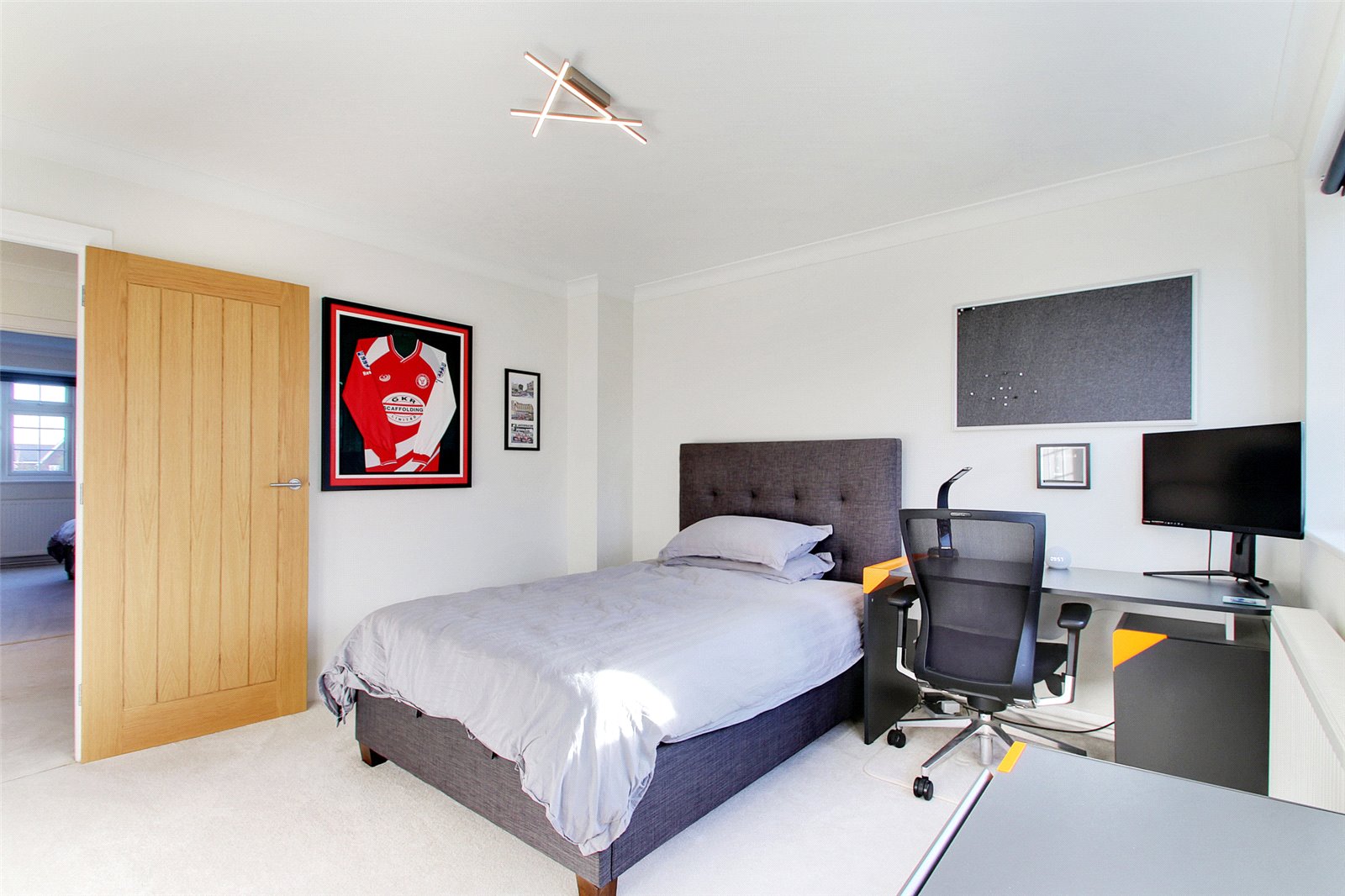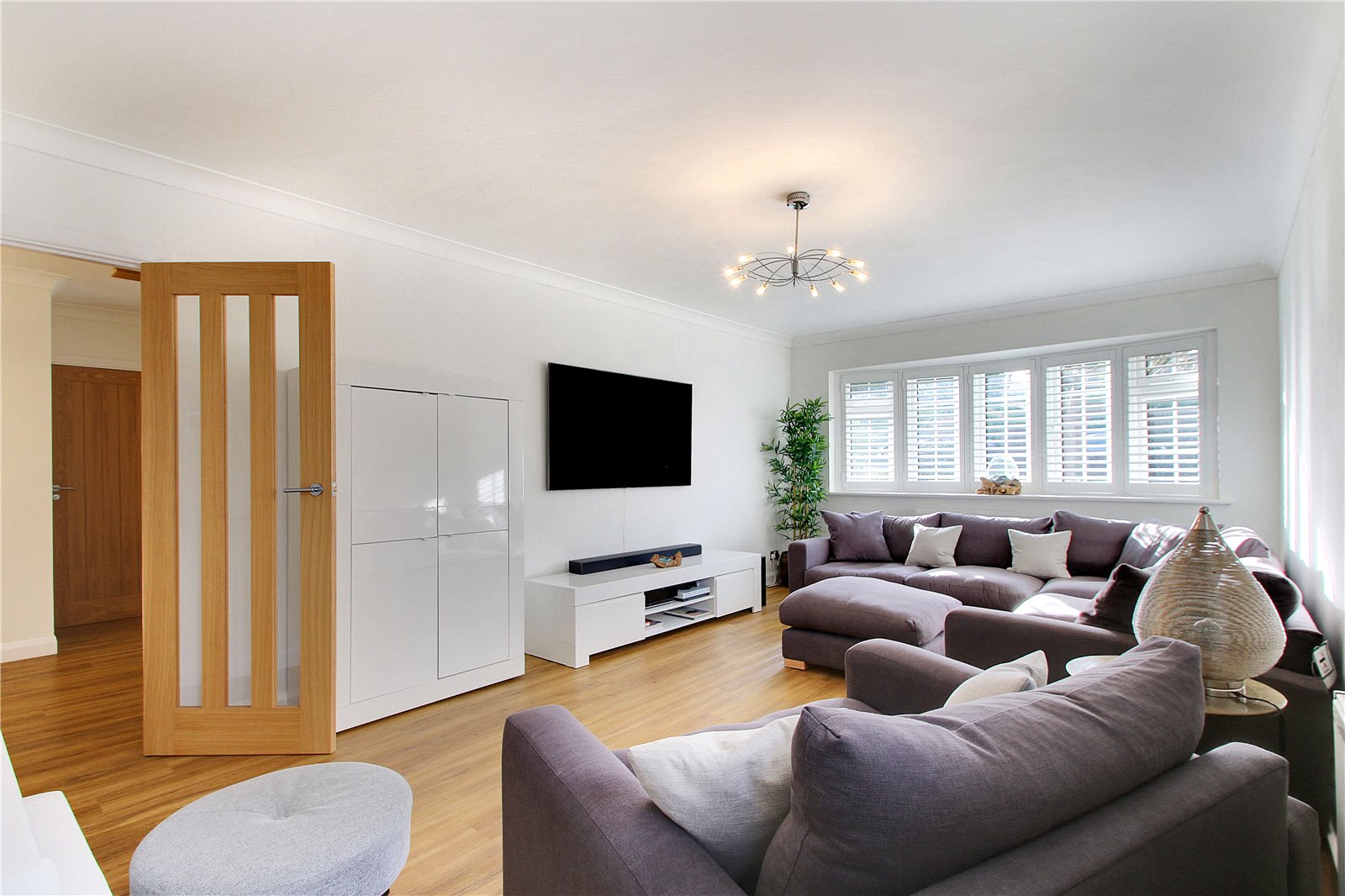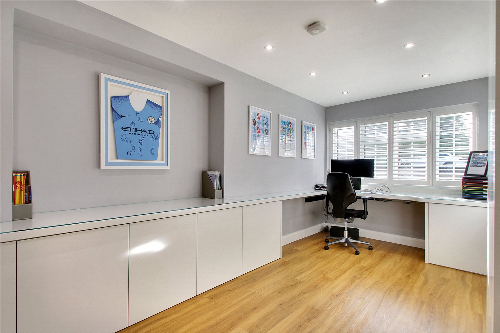 The office / playroom has bespoke furniture with desk, all reception rooms are laid to light oak DesignBelag flooring.