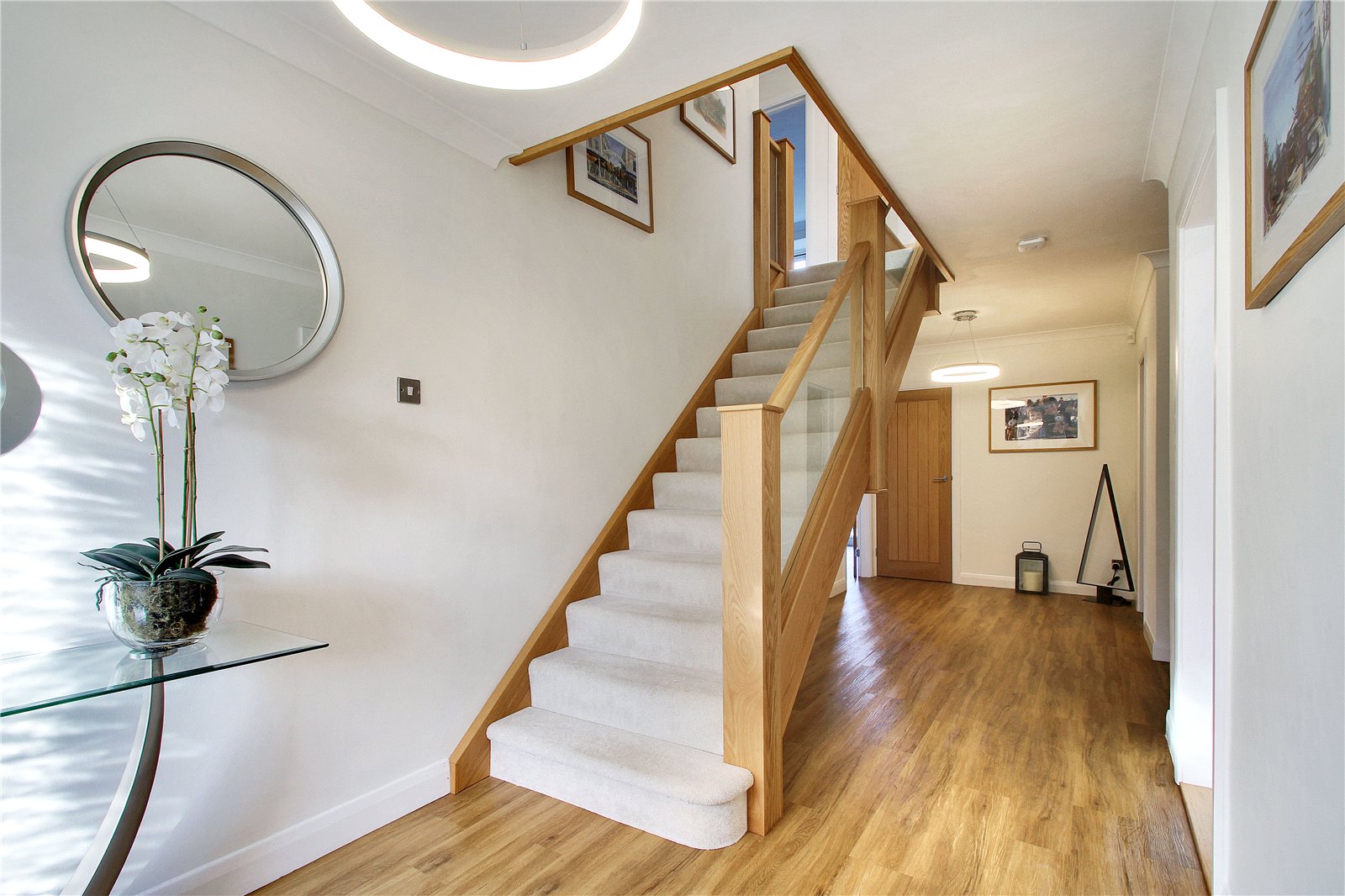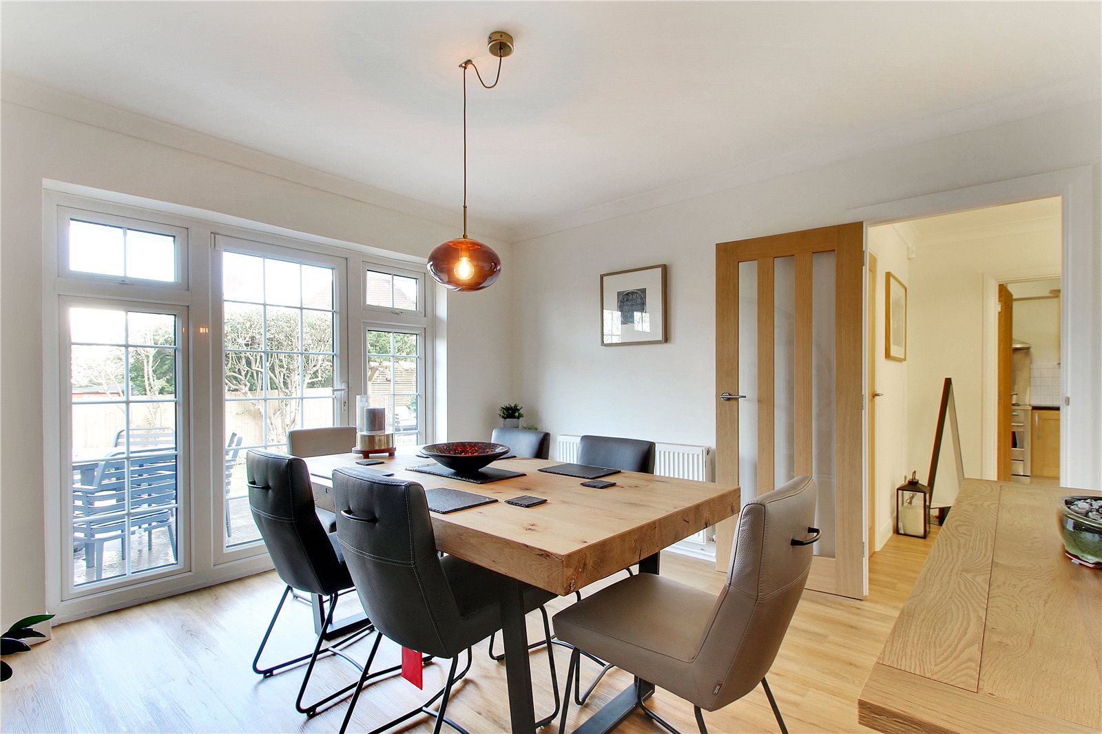 Positioned in this sought after development built by renowned local builder R.J. Billings this substantial detached house has been thoughtfully renovated creating a contemporary feel throughout. The large entrance hall has oak staircase with glass balustrade. There are two large reception rooms with French doors from the dining room opening onto landscaped gardens.