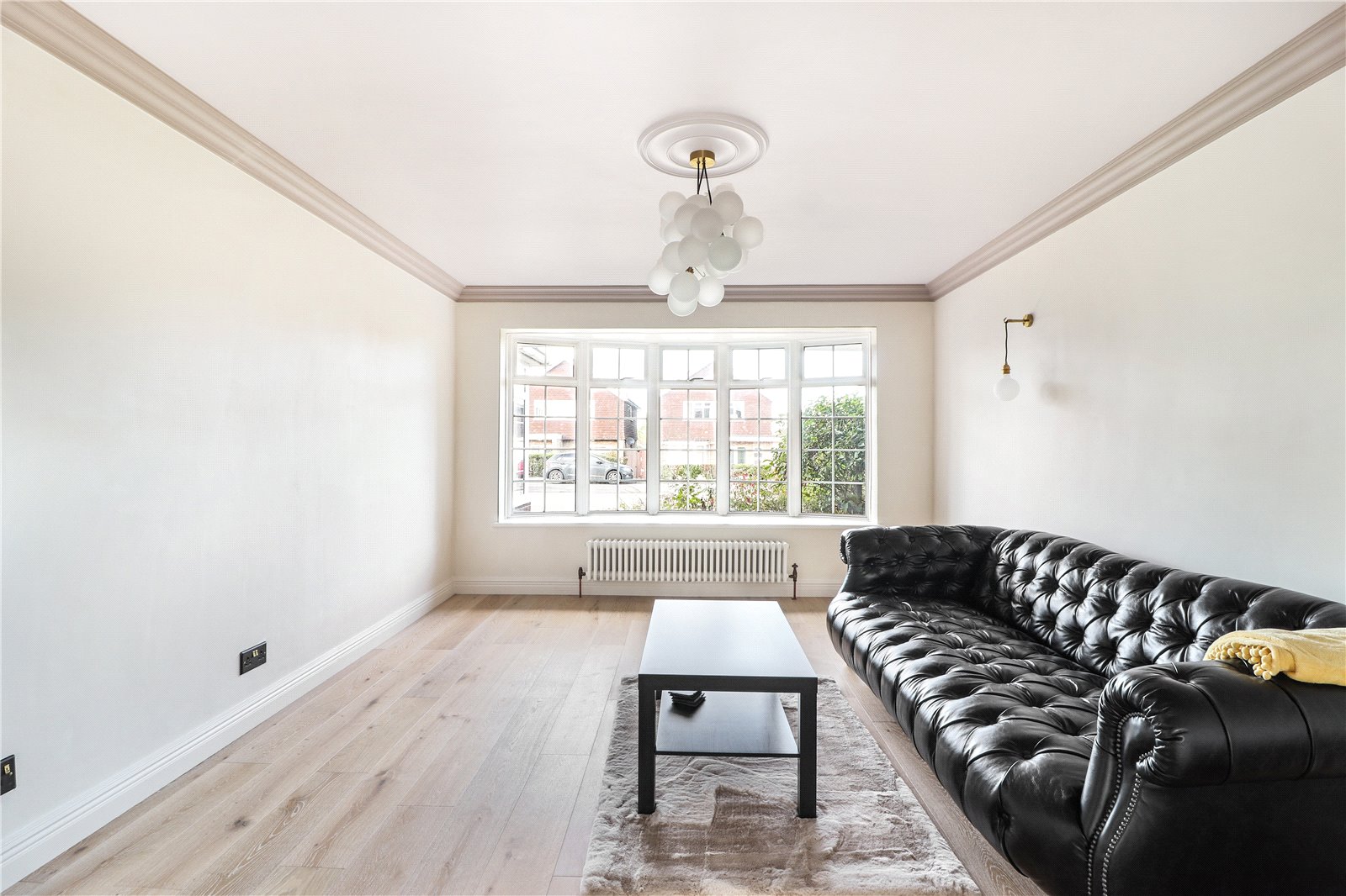 Sitting Room 14'7" x 11'11" (4.45m x 3.63m). Double glazed Georgian style window to front. New engineered wood flooring. Plain coved ceiling. Ceiling rose. Replacement period style radiator. Double doors to rear.
