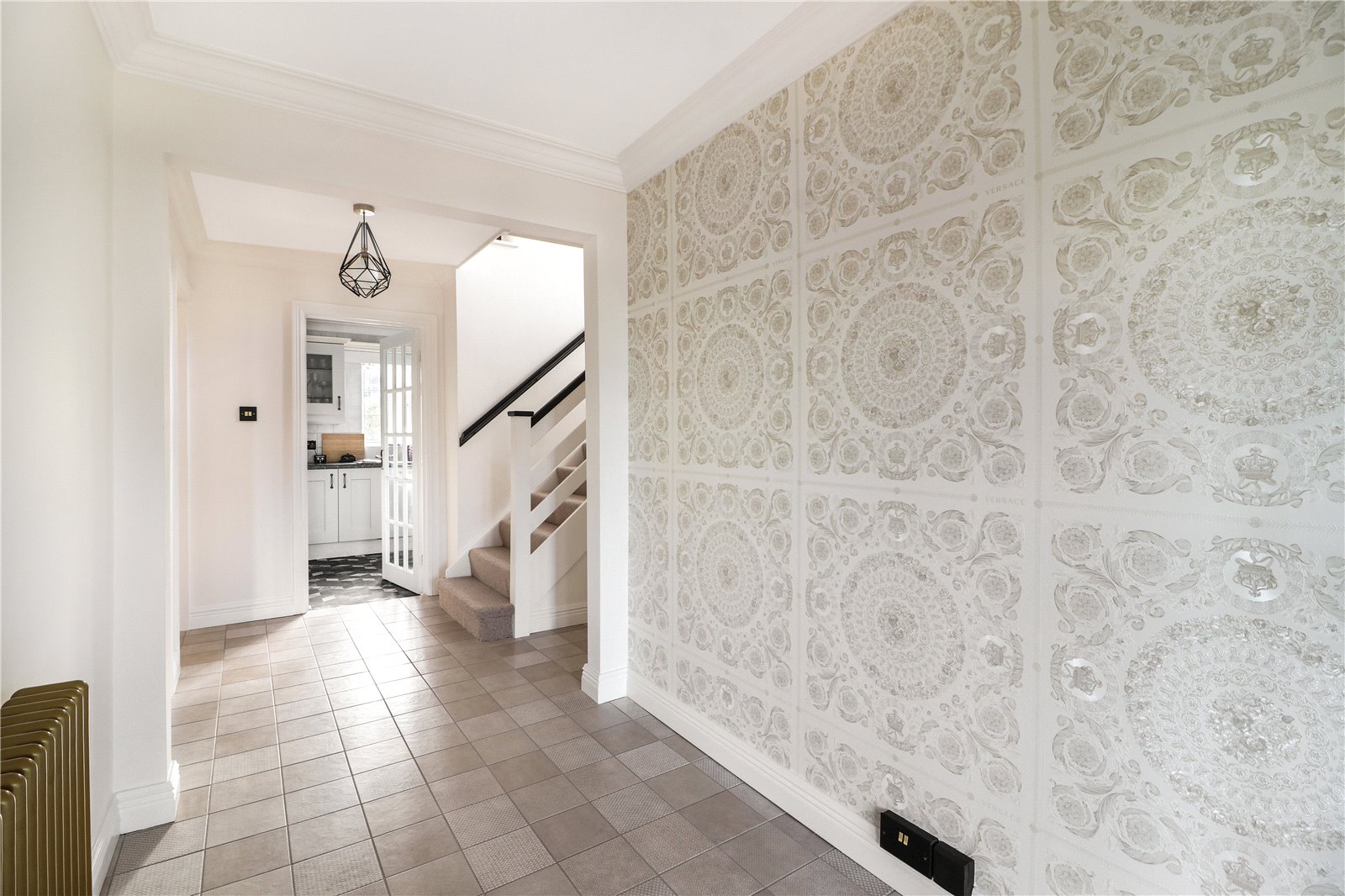 Entrance Hall Glazed panelled door to front with matching window to front. Tiled flooring. Plain coved ceiling. Replacement period style radiator.