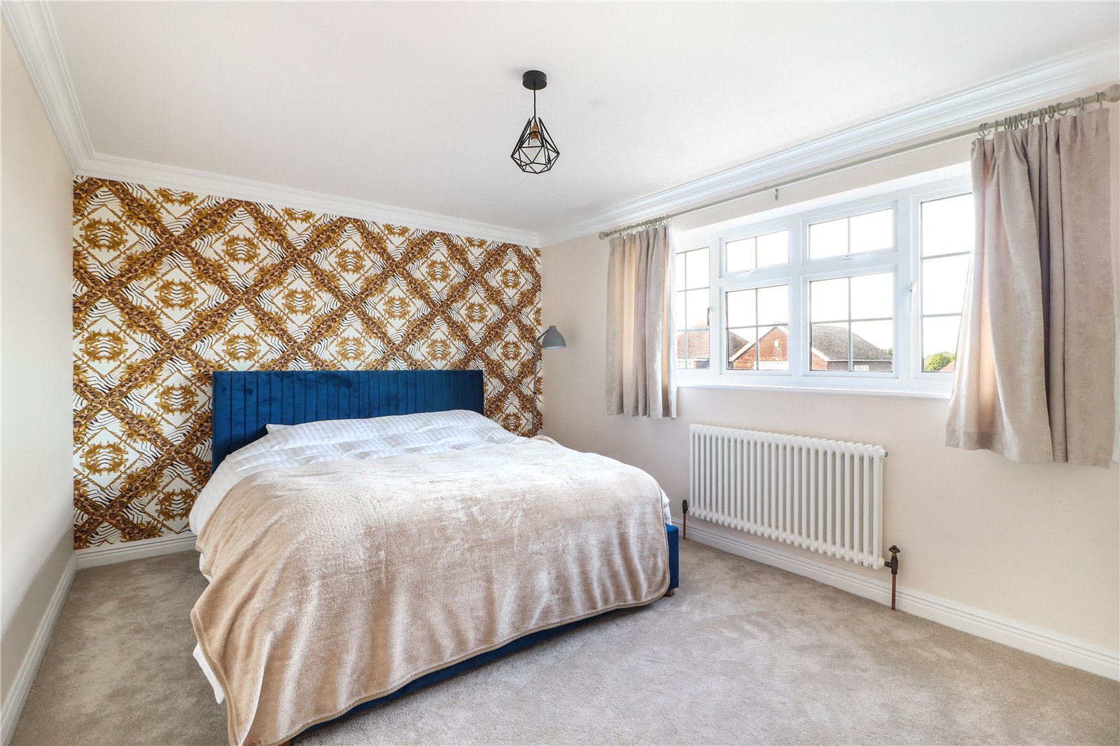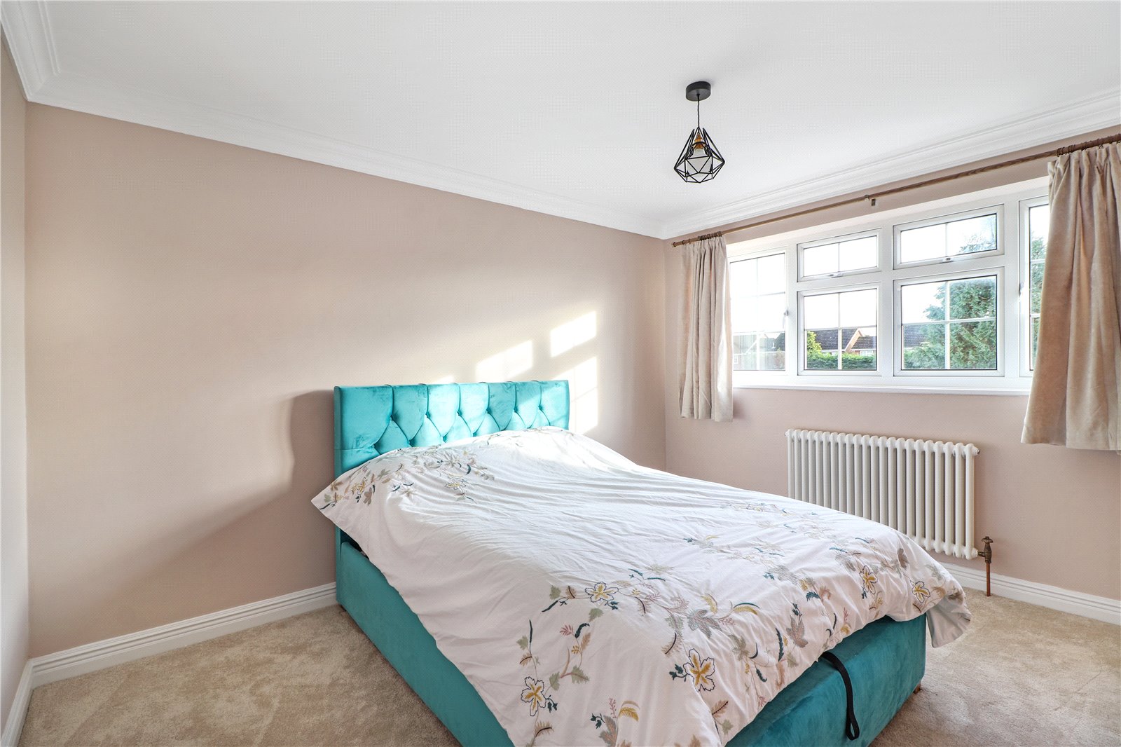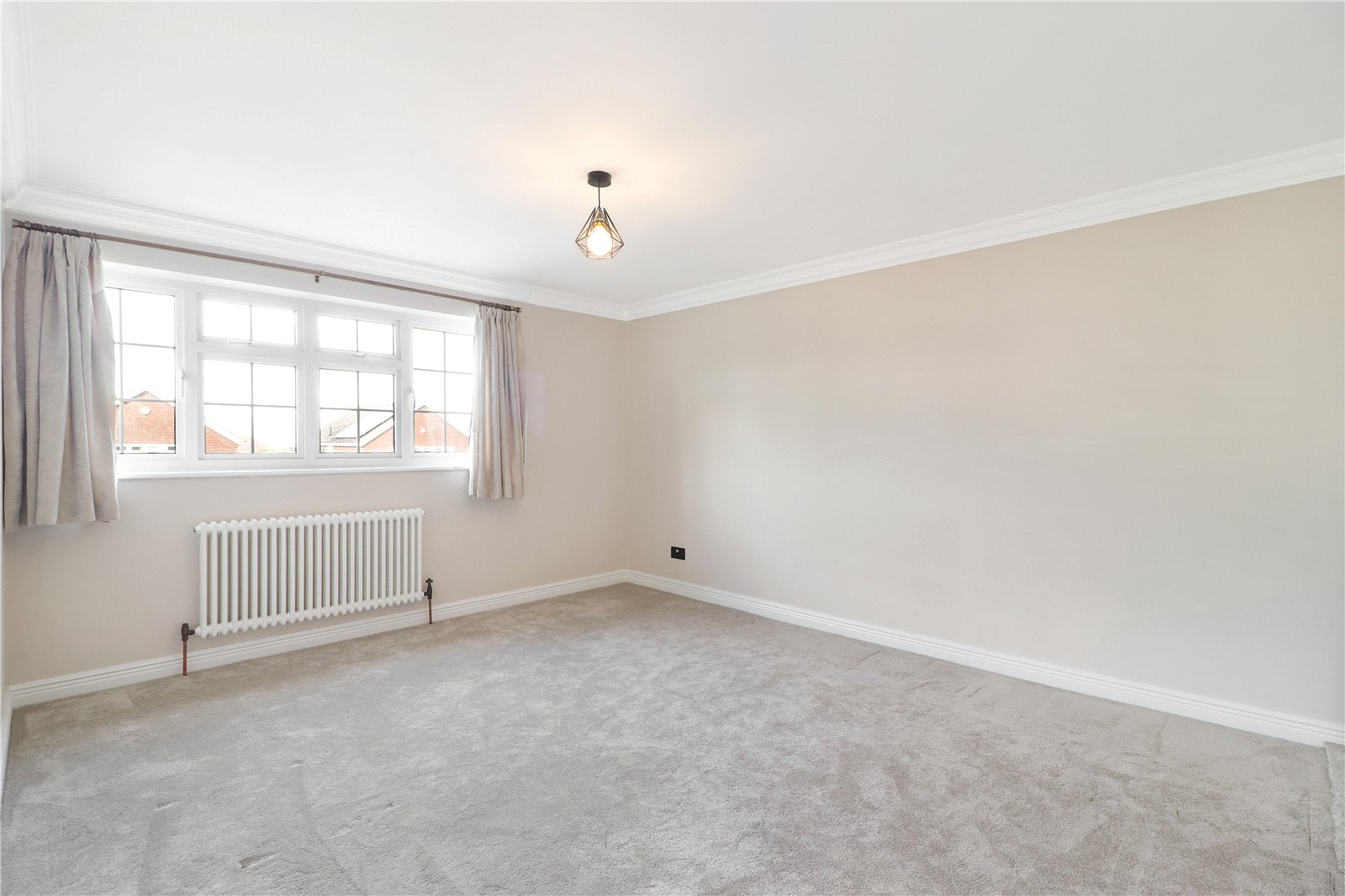 Bedroom 14'11" x 10'9" (4.55m x 3.28m). Double glazed Georgian style window to front. New laid carpet. Plain coved ceiling. Replacement period style radiator.