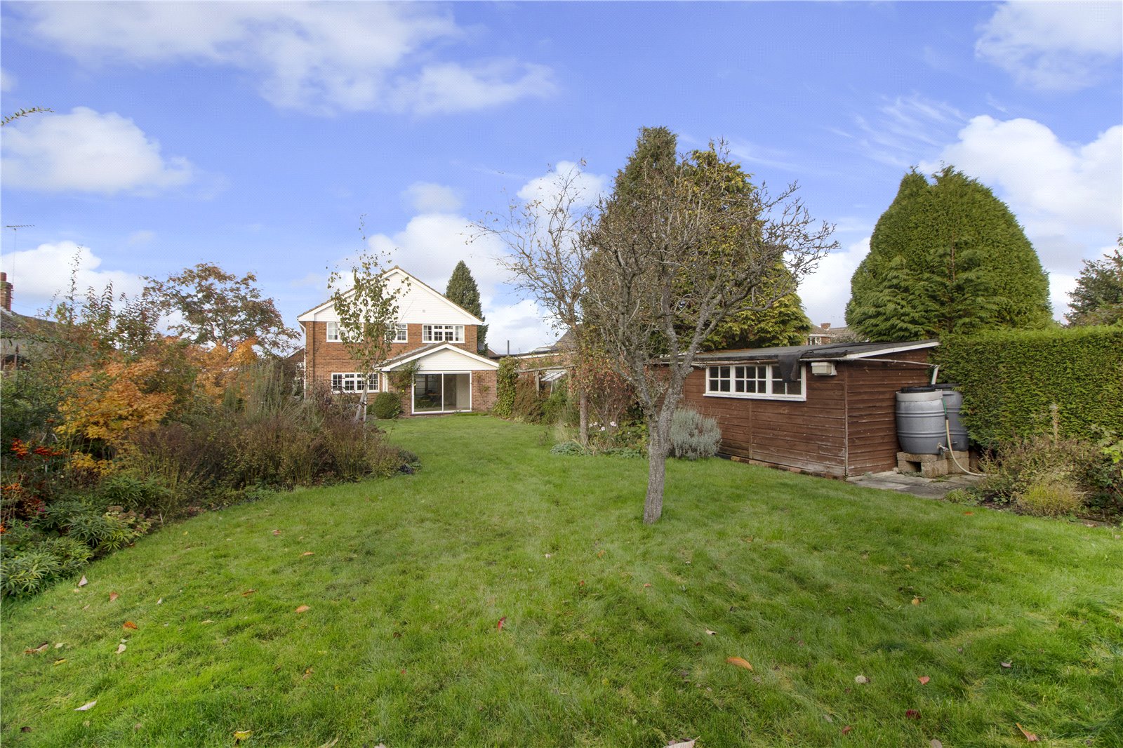 Rear Garden South facing established garden. Paved patio with brick built barbeque. Lawn with path, flower beds and trees. Two sheds. Greenhouse. Side access. Garden electrical sockets.