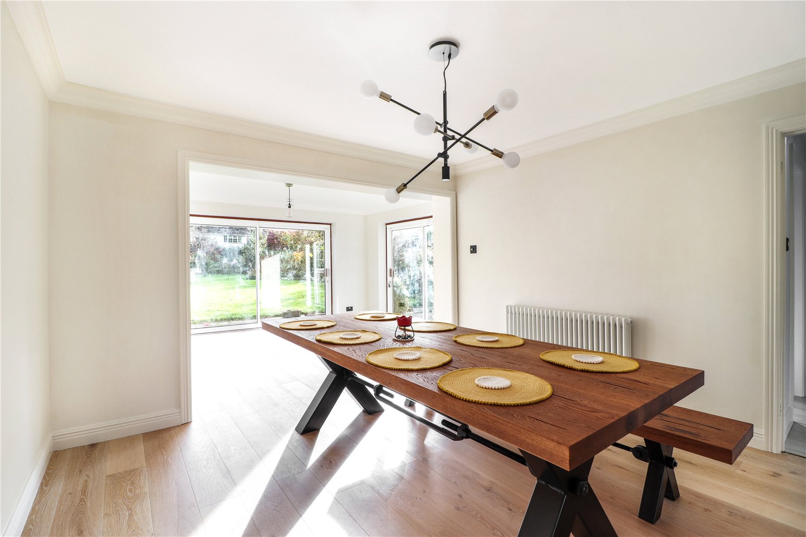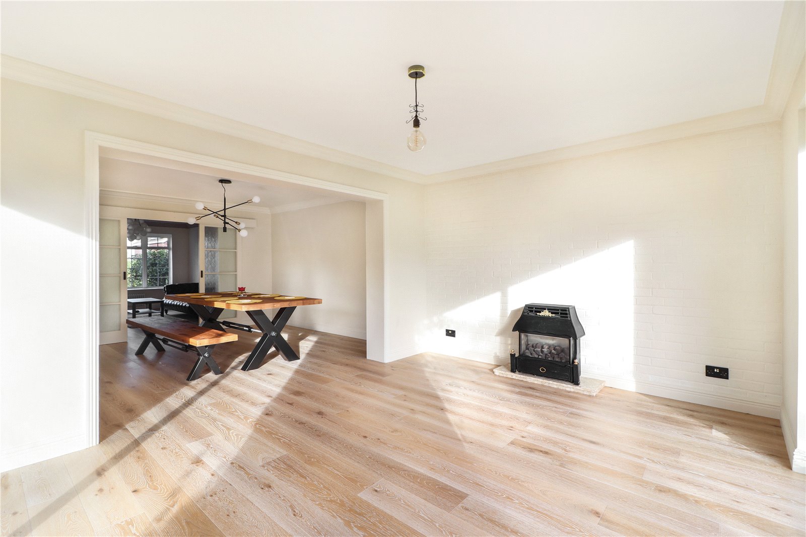 Dining Room 12'3" x 11'11" (3.73m x 3.63m). New engineered wood flooring. Plain coved ceiling. Replacement period style radiator.