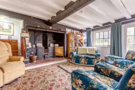 Living Room - 4.93m x 4.11m (16'2 x 13'6) - Original Inglenook fireplace, night storage heater, exposed wall and ceiling timbers, front and rear aspect windows with a private outlook over the garden, door to the rear patio.