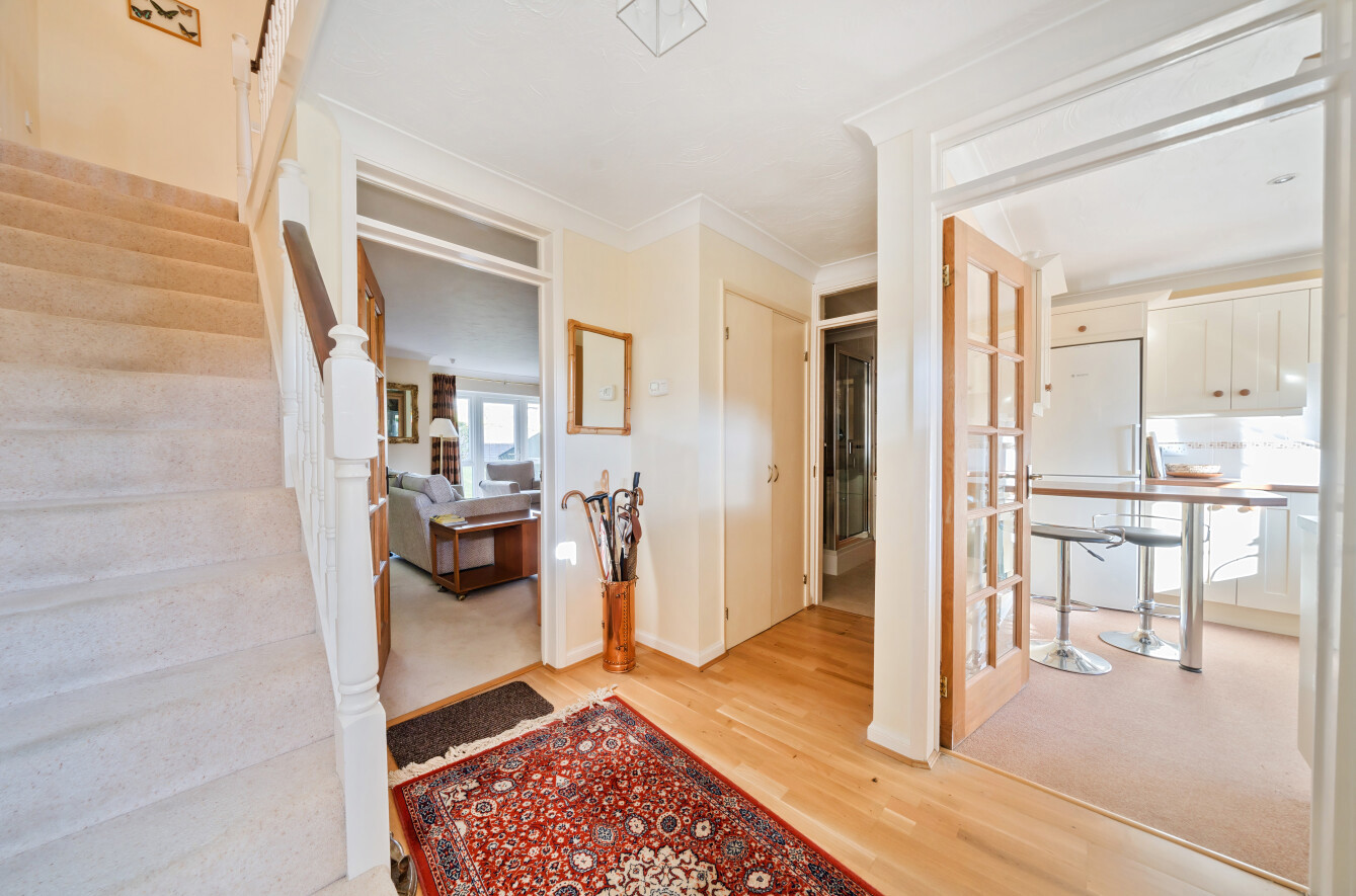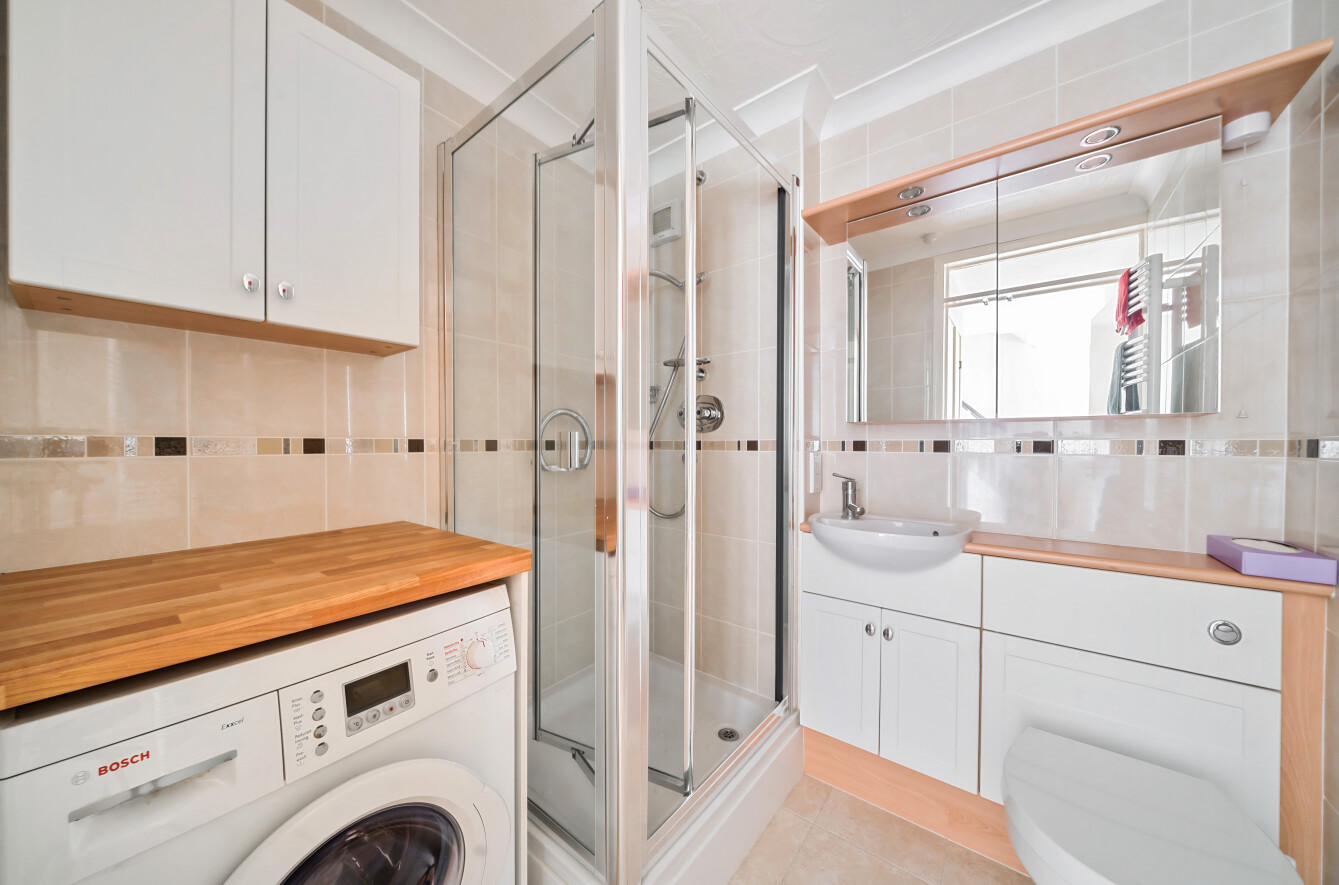 To the front of the house lies a bright and airy kitchen, offering a pleasant view of the surroundings. Adjacent is the spacious living room, adorned with French doors that open up to the serene rear communal gardens, inviting natural light into the space. An additional office or dining area provides flexibility for various lifestyle needs, while a convenient cupboard underneath the stairs offers practical storage solutions. The ground floor also benefits from a shower room and WC, which also includes space and plumbing for a washing machine.