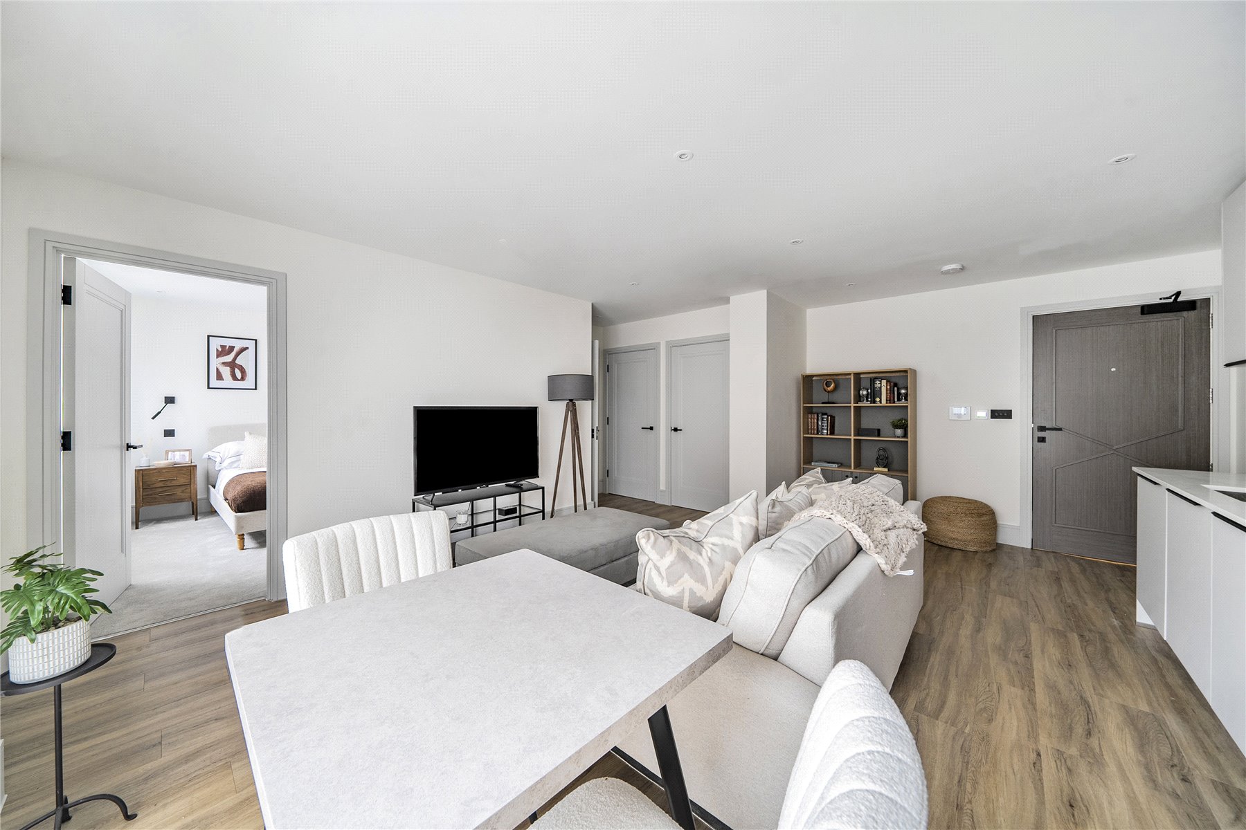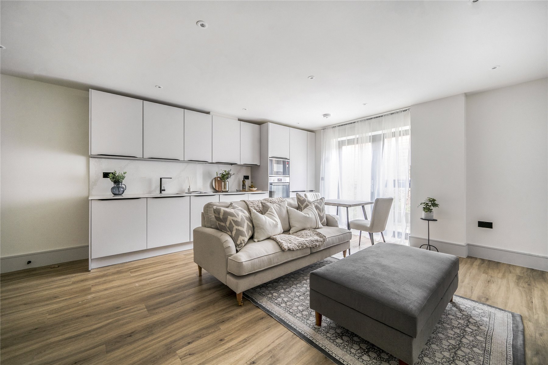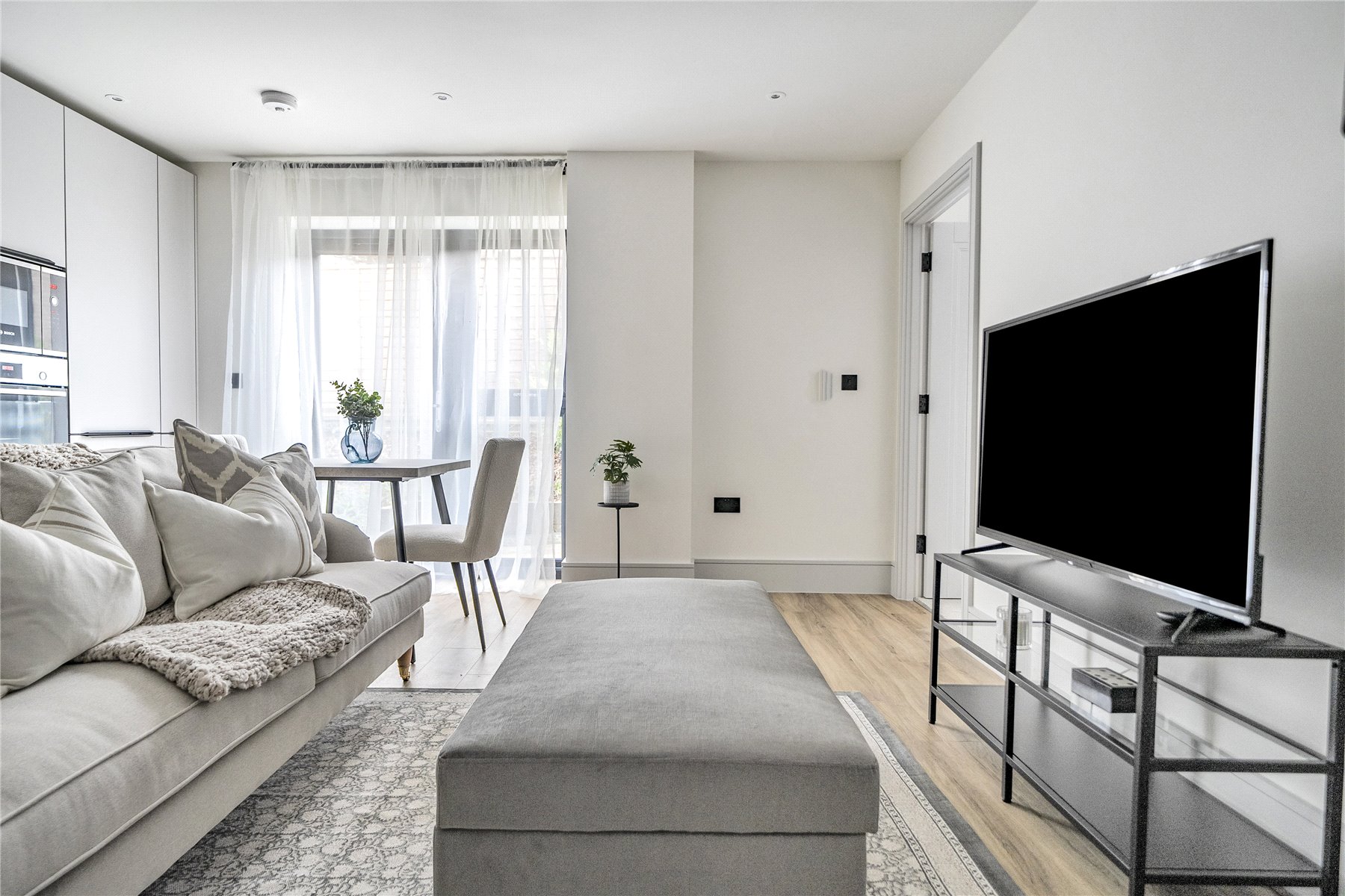 Upon entering, you're greeted by a light-filled open-plan kitchen, living and dining space, ideal for relaxing or entertaining. The sleek contemporary kitchen features quartz worktops and a full suite of integrated appliances including a fridge freezer, dishwasher, and washing machine, all finished to the highest standard.