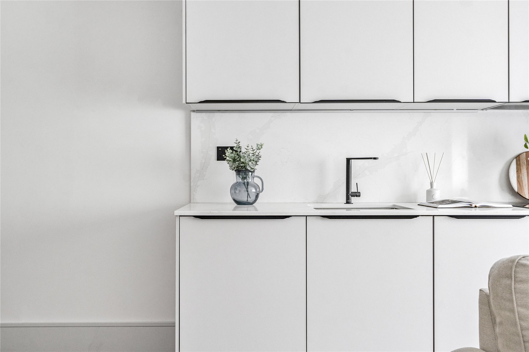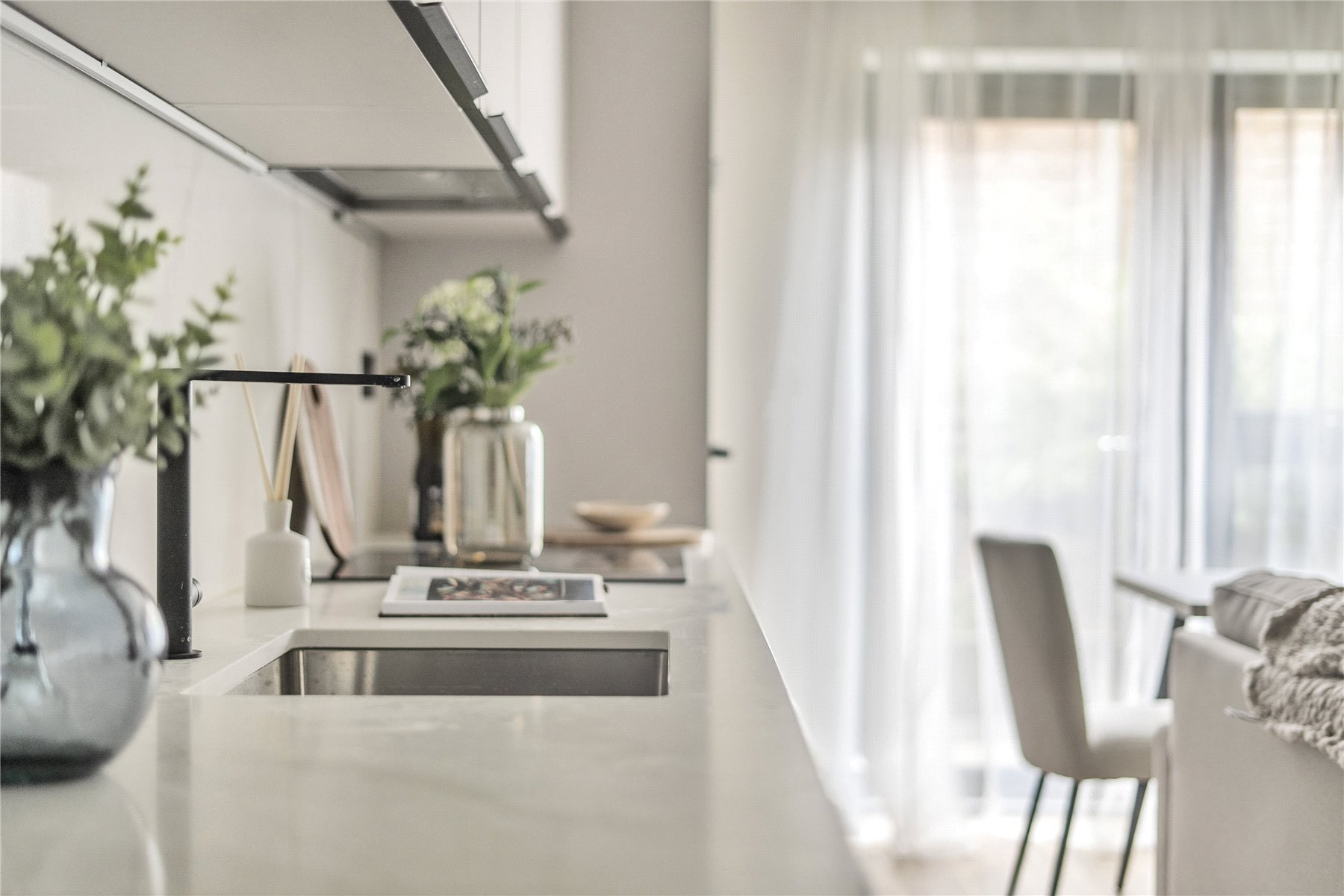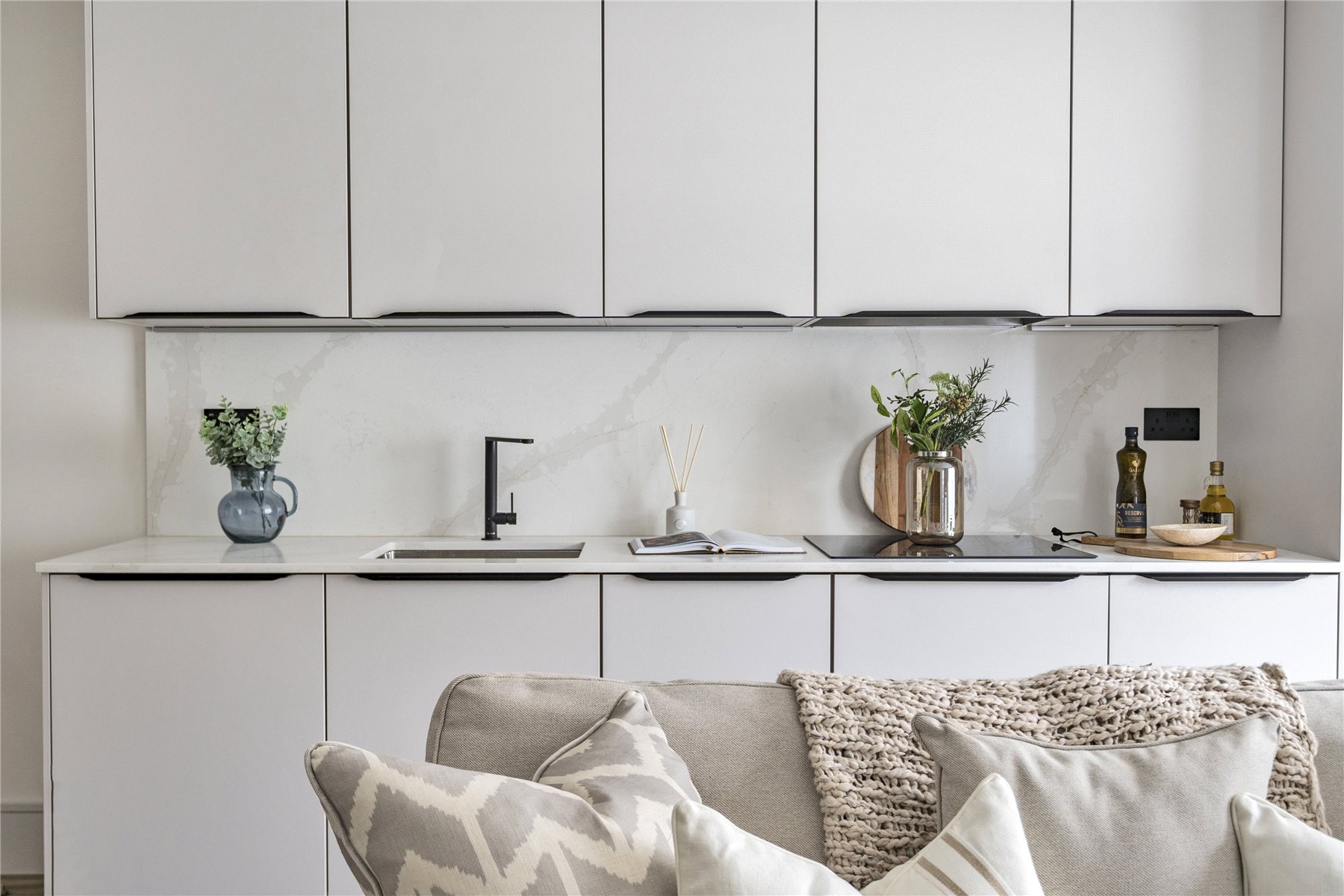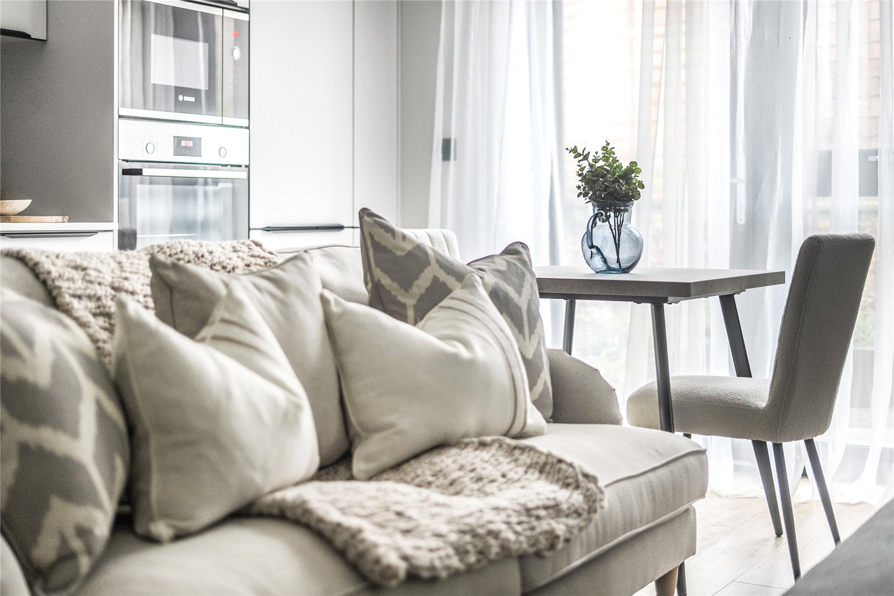 Upon entering, you're greeted by a light-filled open-plan kitchen, living and dining space, ideal for relaxing or entertaining. The sleek contemporary kitchen features quartz worktops and a full suite of integrated appliances including a fridge freezer, dishwasher, and washing machine, all finished to the highest standard.