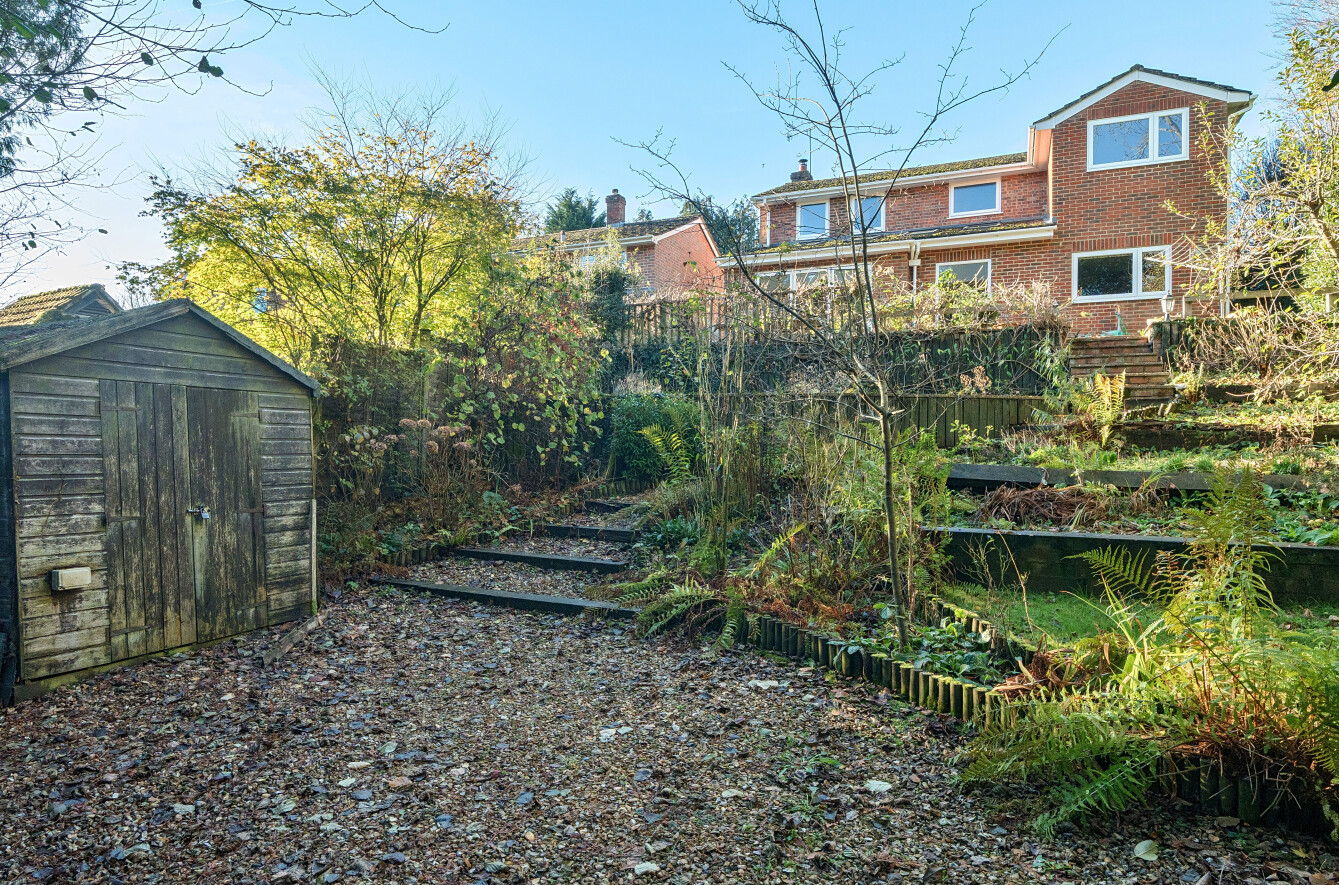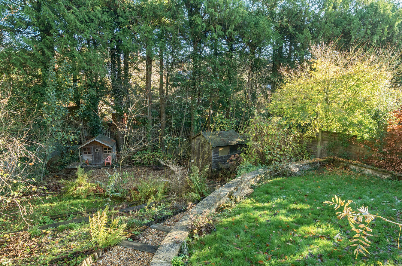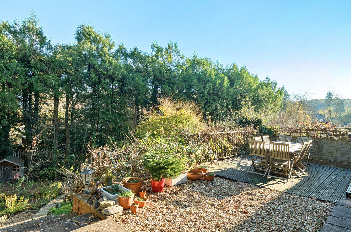 One of the most appealing features of the home is its beautifully tiered rear garden. Designed to make the most of its elevated position, the garden offers a series of gently rising levels framed by mature planting, ferns and established shrubs. Pathways and steps lead to peaceful seating spots that capture sunlight at different times of the day, while the surrounding greenery gives the space a wonderfully private and natural feel.
