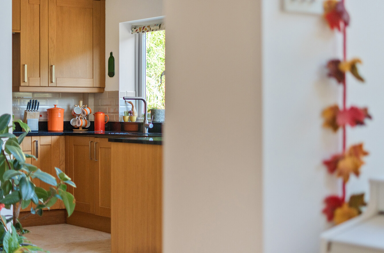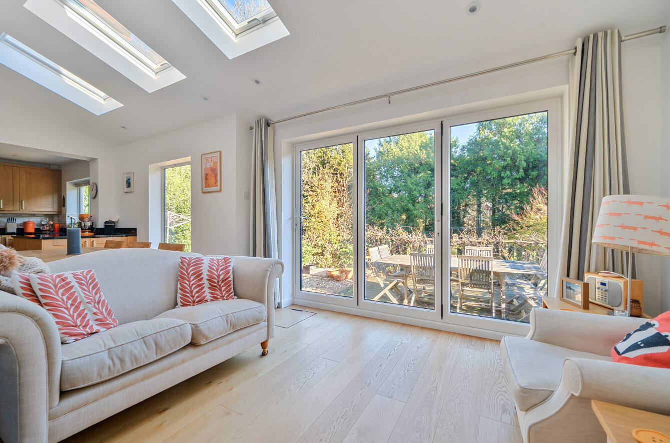 The front door opens into a welcoming entrance hall that sets the tone for the rest of the house, leading directly into a bright and well-proportioned living room. This inviting space is centred around a contemporary wood-burning stove, offering warmth and character, while large windows allow daylight to filter in throughout the day. An open-plan connection leads through to the expansive dining and family area, for both relaxed and versatile living. Skylights overhead and full-height glazing to the rear transform this room into a striking focal point of the home with bifold doors opening onto the rear garden, making the space ideal for hosting, family gatherings or simply enjoying peaceful views over the greenery beyond.