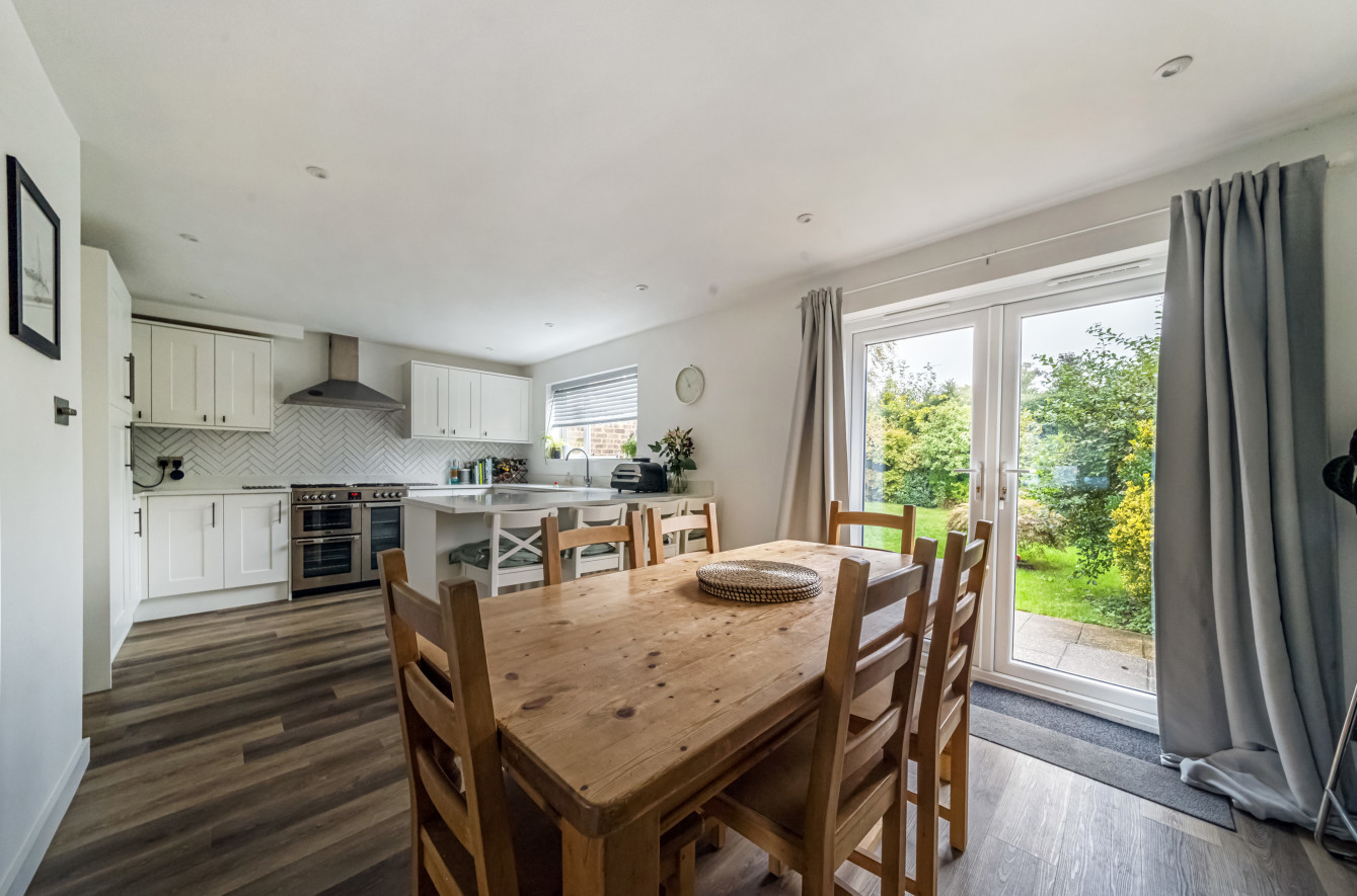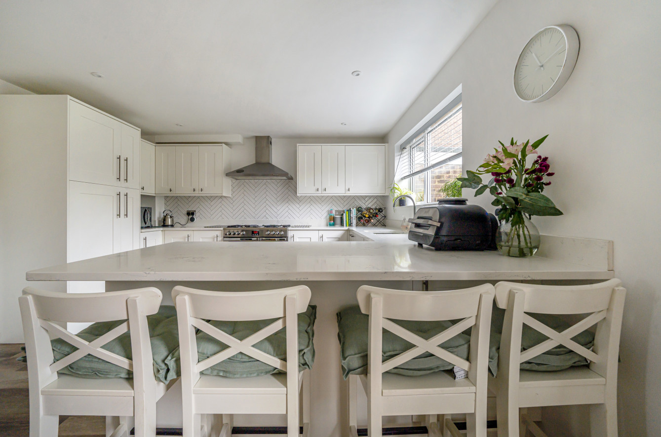 The kitchen area is equipped with modern appliances, and a chic peninsula breakfast bar provides the ideal spot for casual meals. Glass patio doors open onto the rear garden, allowing for a seamless transition between indoor and outdoor living.