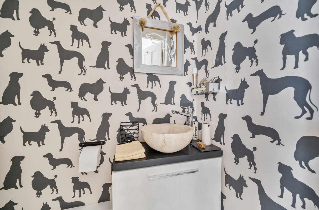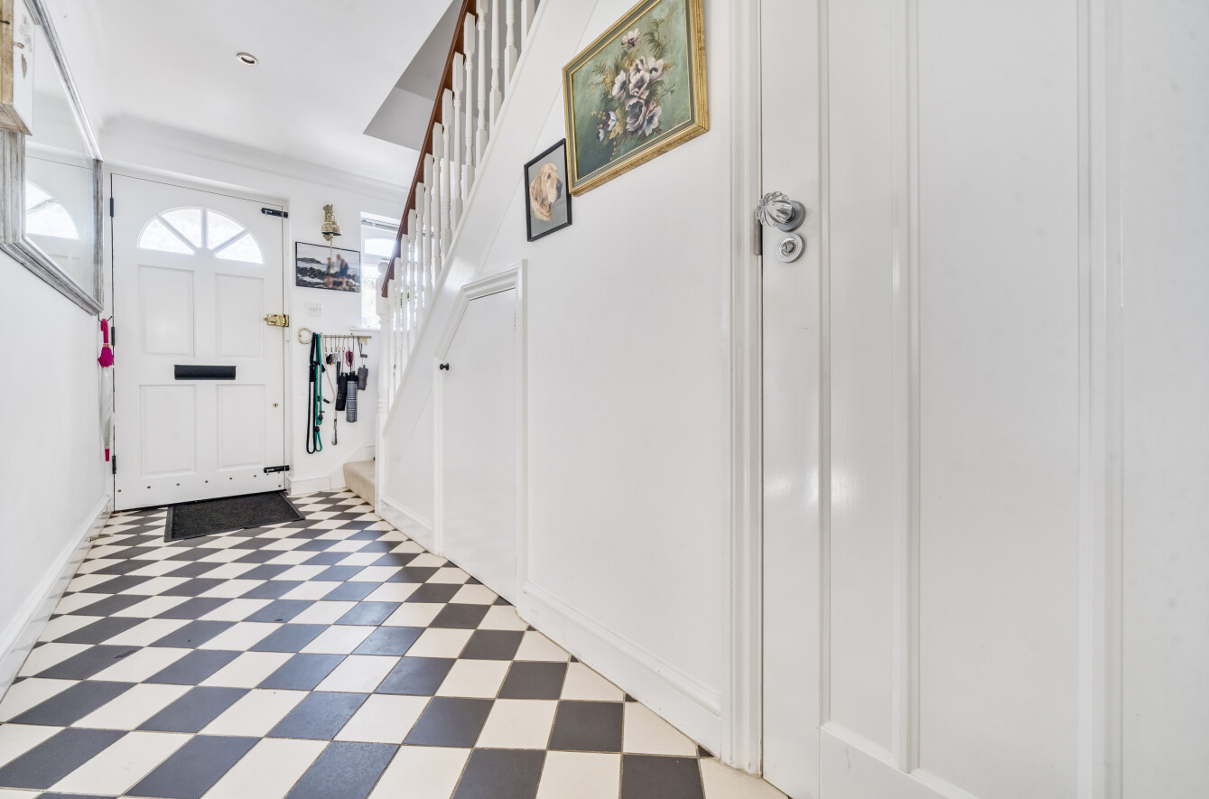 The ground floor opens into a welcoming entrance hall with stylish black-and-white tiled flooring and useful under-stairs storage. A modern fitted kitchen sits to the front of the property, featuring sleek cabinetry, ample worktop space, and direct access to the outside. To the rear, the bright and spacious living/dining room spans the width of the house, complete with a feature fireplace and French doors leading out to a private courtyard garden a wonderful spot for outdoor dining and entertaining.