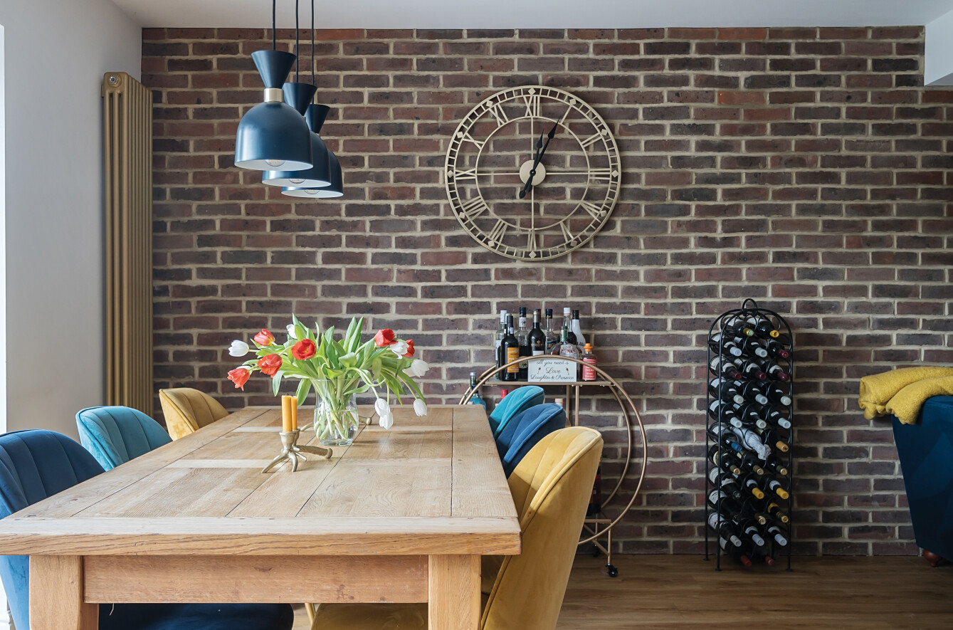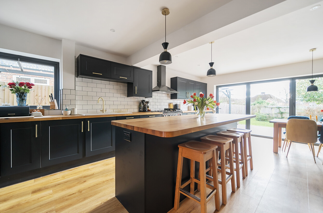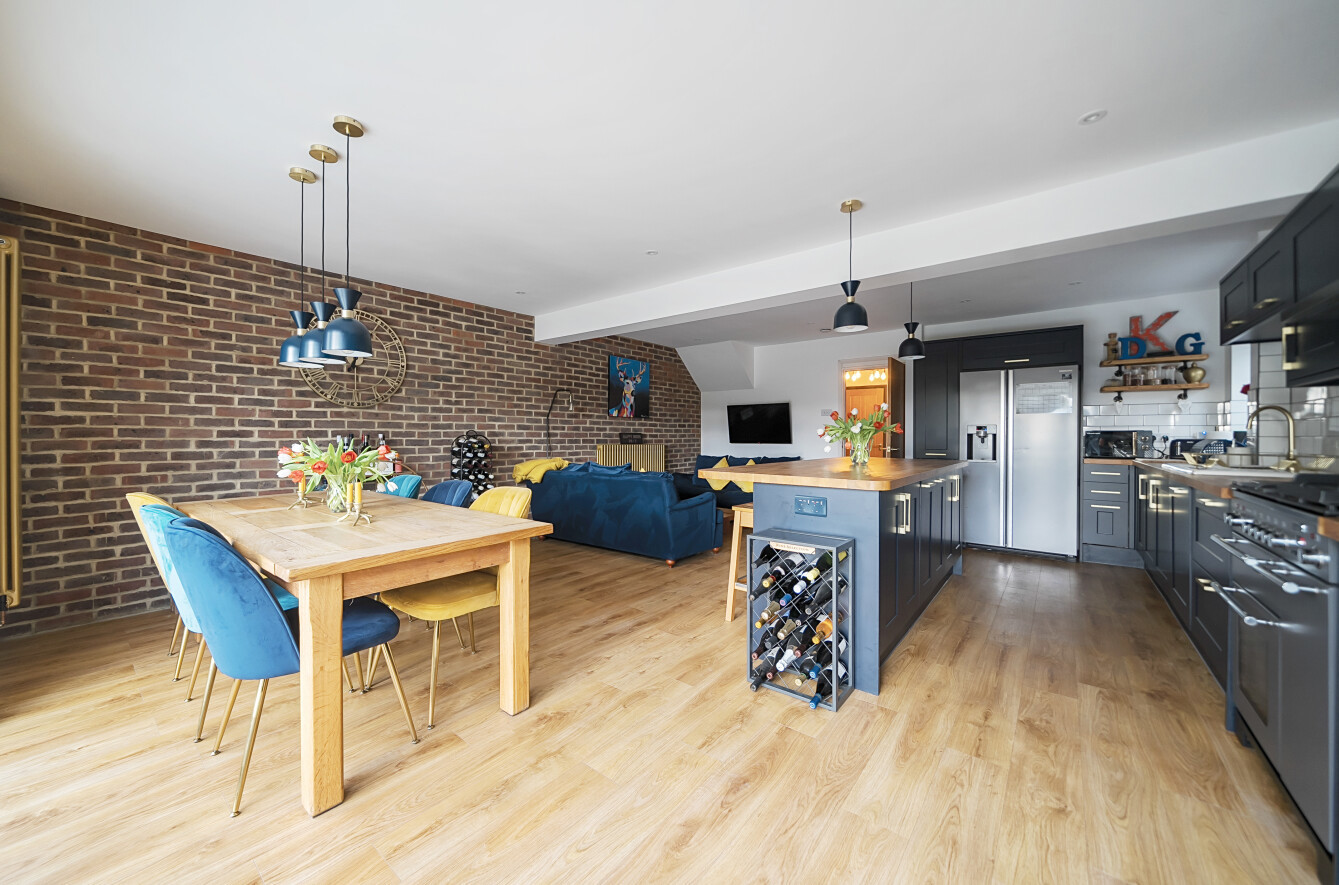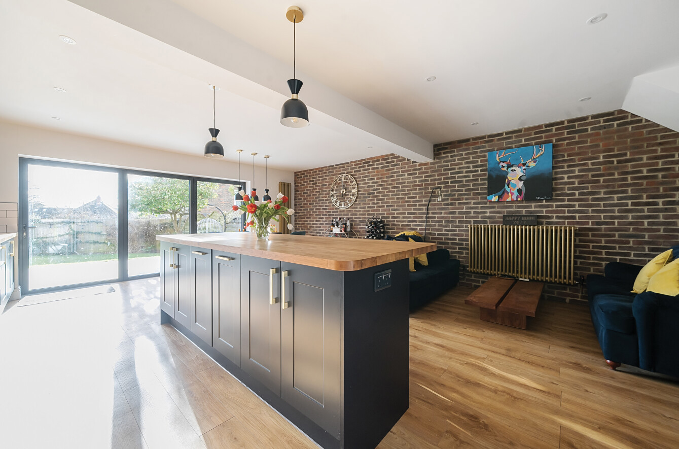 At the rear of the home, the standout feature is the expansive open-plan kitchen/living/dining room, designed to be the heart of the house. The kitchen is tastefully fitted with a contemporary shaker-style design, featuring wood work surfaces, tiled splashbacks, and a striking central island with a breakfast bar. This well-thought-out layout seamlessly integrates style and functionality, making it a joy to cook, dine, and entertain. The living and dining areas provide ample space for relaxation and hosting guests, enhanced by the warmth and character of a stylish exposed brick wall. Natural light floods the room through bi-fold doors, which open directly onto the garden, creating an effortless flow between indoor and outdoor spaces.