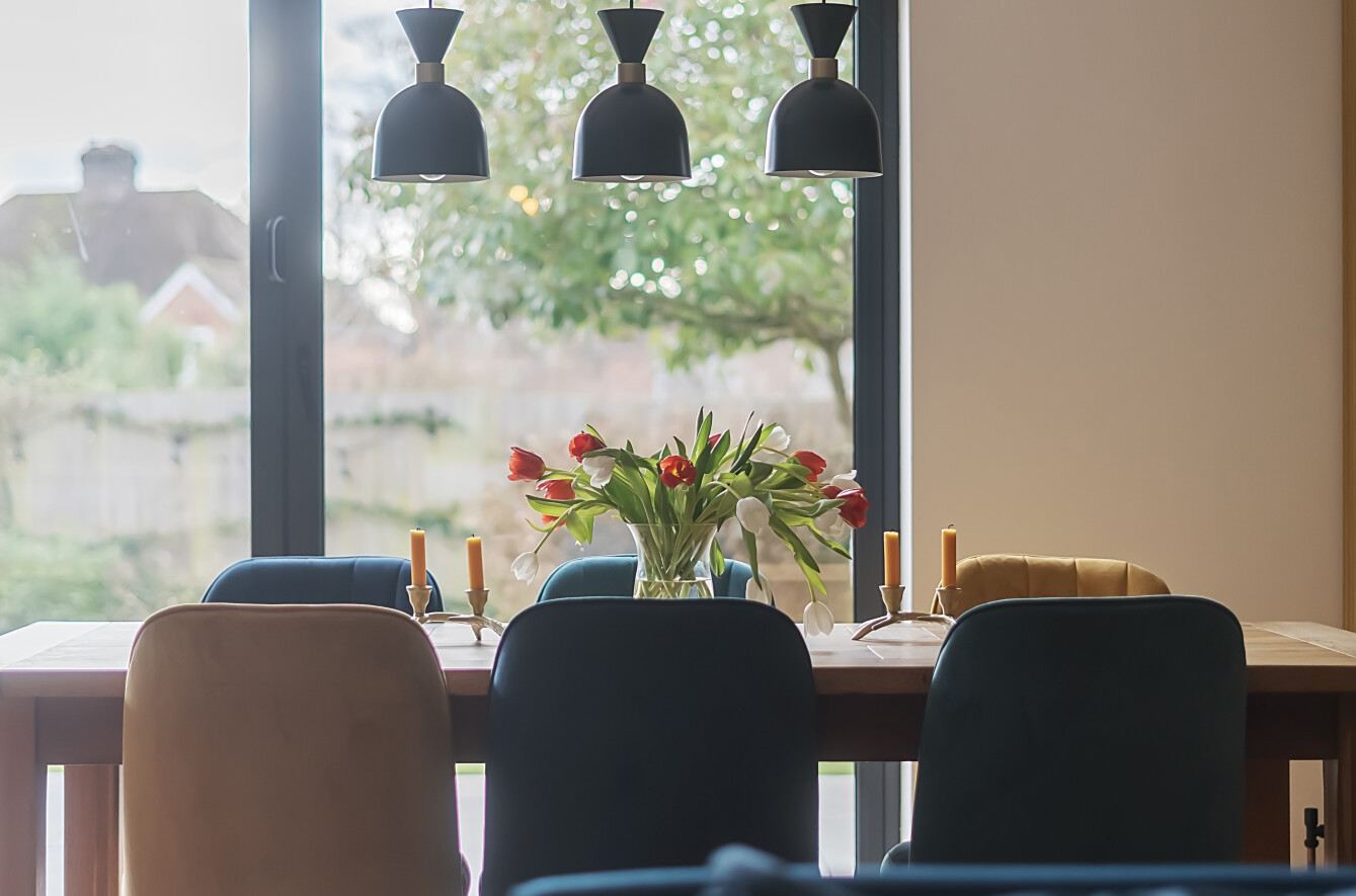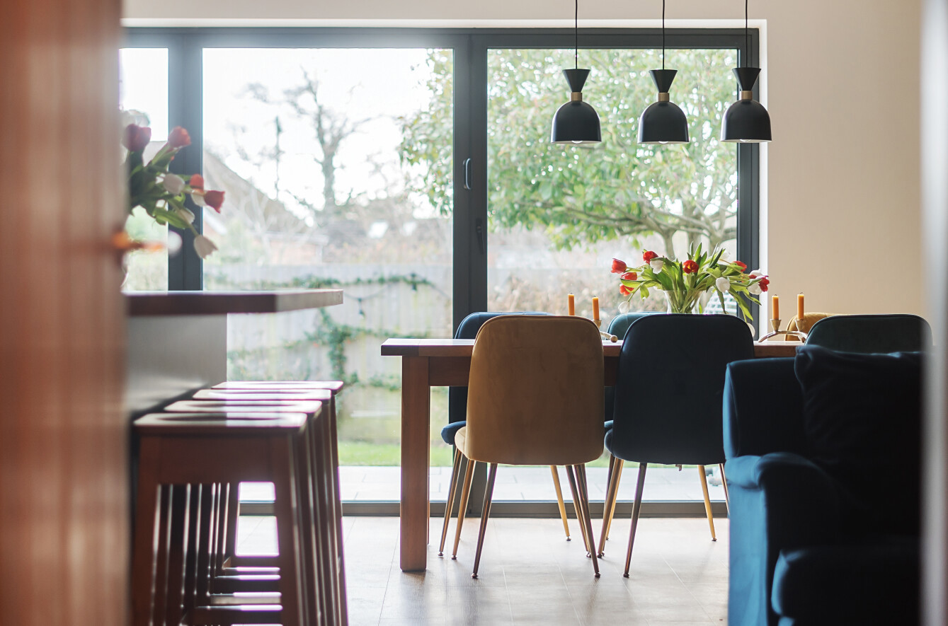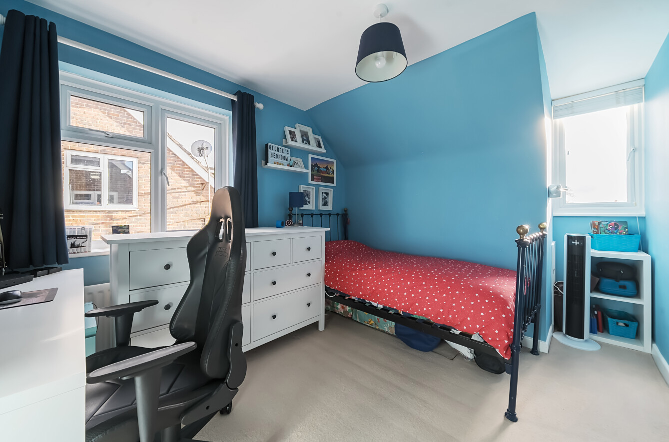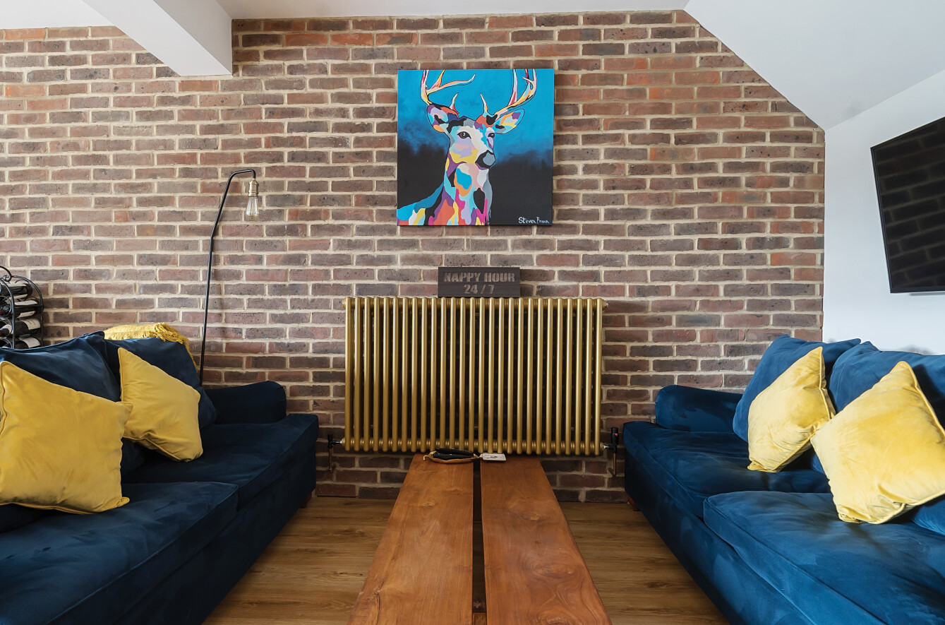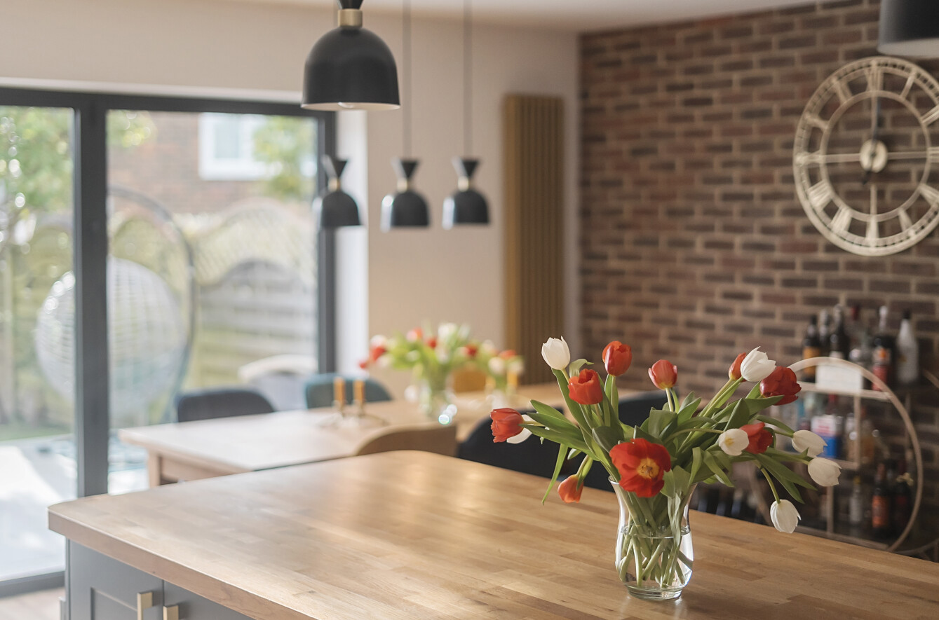At the rear of the home, the standout feature is the expansive open-plan kitchen/living/dining room, designed to be the heart of the house. The kitchen is tastefully fitted with a contemporary shaker-style design, featuring wood work surfaces, tiled splashbacks, and a striking central island with a breakfast bar. This well-thought-out layout seamlessly integrates style and functionality, making it a joy to cook, dine, and entertain. The living and dining areas provide ample space for relaxation and hosting guests, enhanced by the warmth and character of a stylish exposed brick wall. Natural light floods the room through bi-fold doors, which open directly onto the garden, creating an effortless flow between indoor and outdoor spaces.