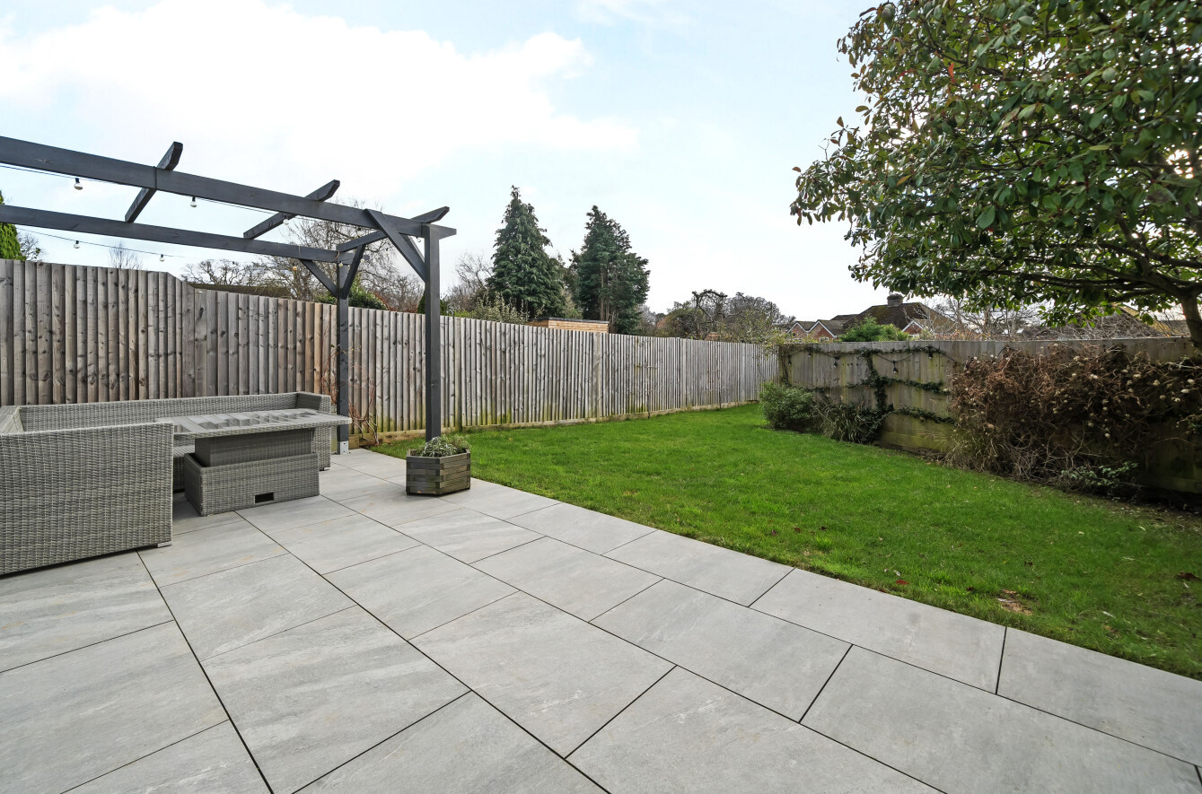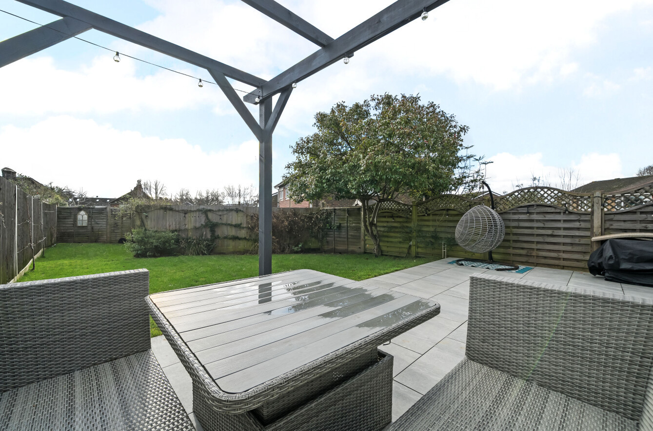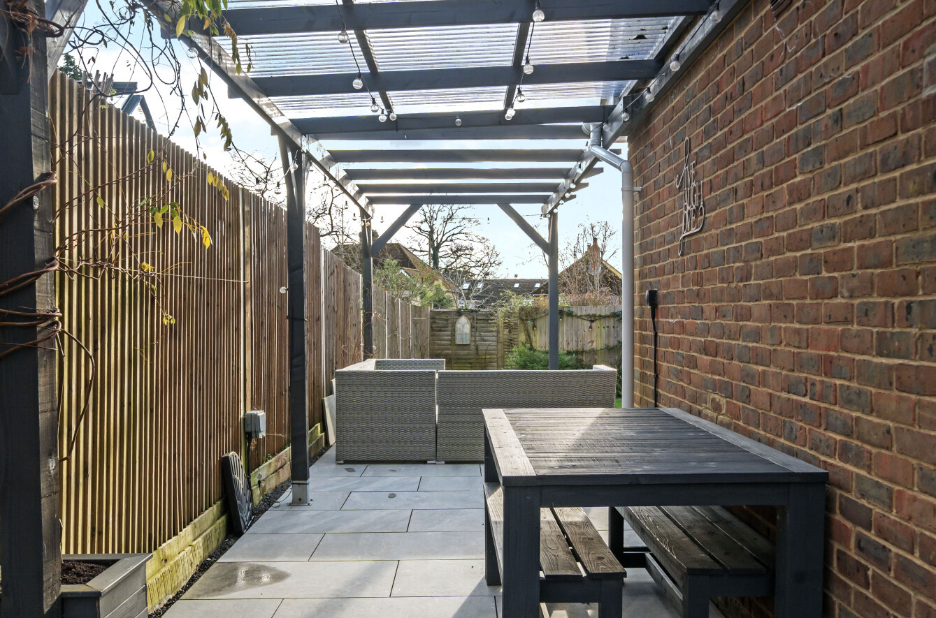 The property sits back from the road, with a block-paved driveway offering off-street parking for two vehicles. At the rear, the garden is a true highlight of this home. A porcelain patio stretches out from the kitchen/living/dining room, providing a perfect space for al fresco dining. A charming pergola adds a decorative touch, while the well-maintained lawn is bordered by panel fencing, creating a secure and private outdoor space for children and pets.