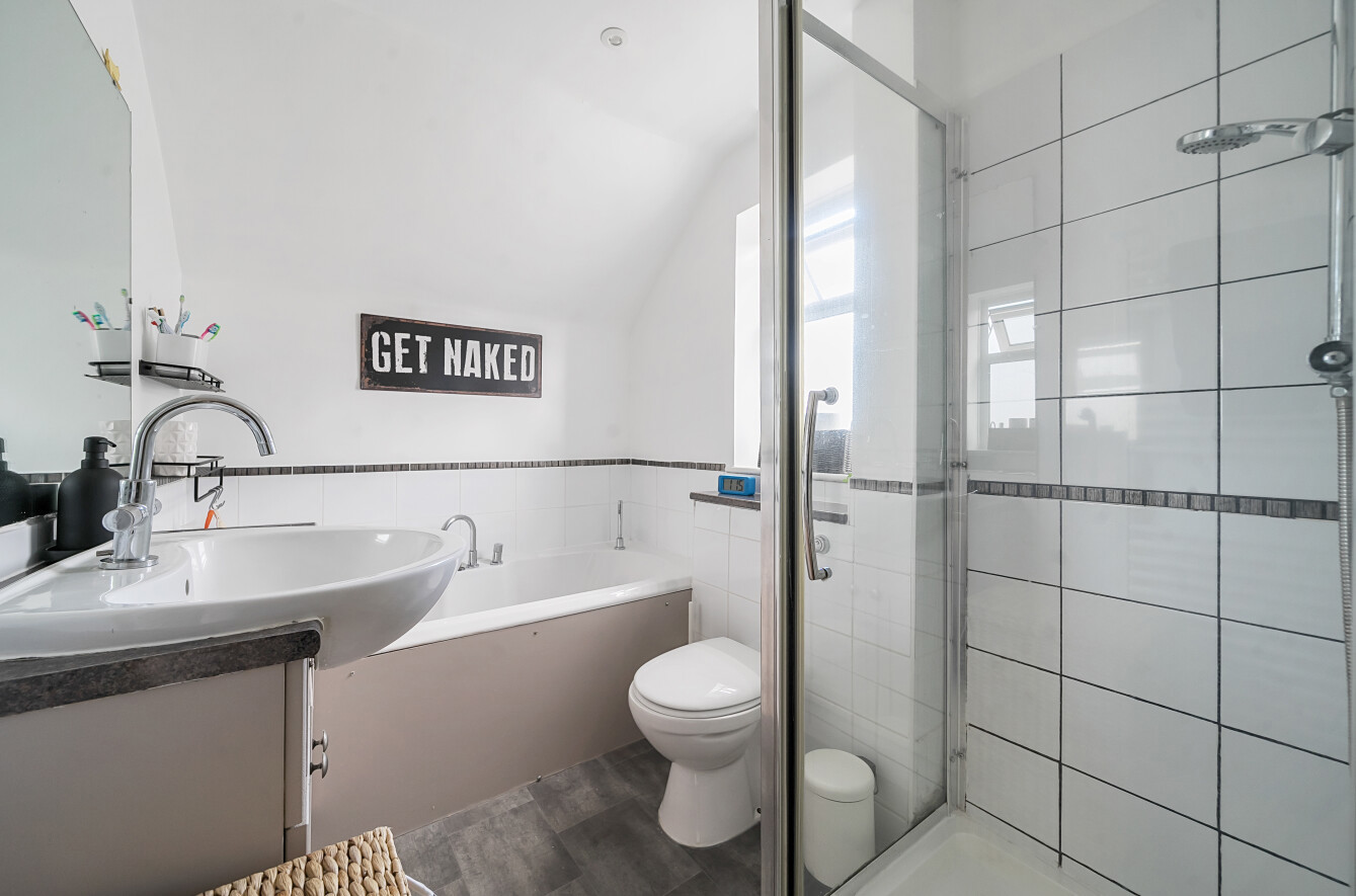 Upstairs, a central landing leads to three generously sized bedrooms, each thoughtfully designed to maximize comfort and storage. Bedroom one features built-in wardrobes, providing excellent storage solutions. The family bathroom is beautifully appointed, with white tiled splashbacks, a bathtub, a separate shower, a WC, and a basin, offering a modern space to unwind.