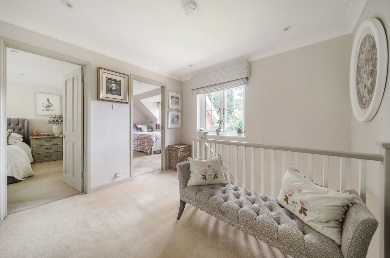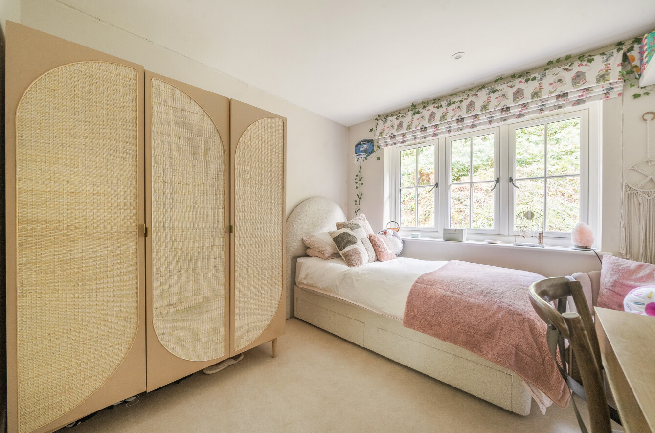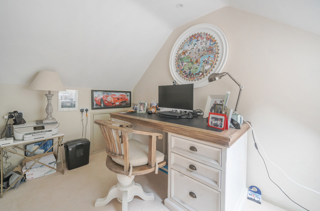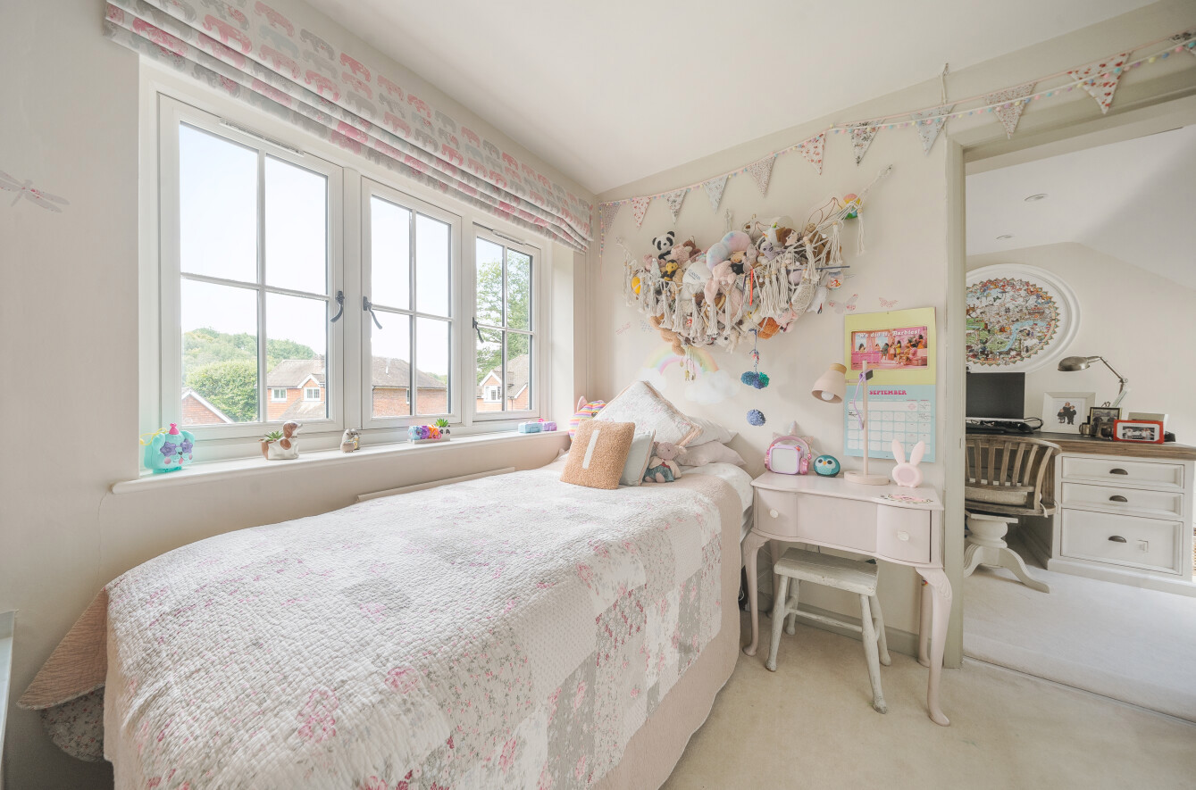 Upstairs, the master bedroom offers a peaceful retreat, complete with built-in wardrobe along with its own en-suite shower room for added comfort. The en-suite smartly finished with marble hexagon tile with contrasting herringbone tiles within the walk-in shower. Two further double bedrooms along with a charming study area, perfect for a home office or reading nook, leads through to the fourth bedroom, offering a unique layout that is ideal for growing families or those seeking separate spaces for work and relaxation. These three bedrooms are all well-proportioned, offering plenty of natural light and space. A family bathroom serves these bedrooms.