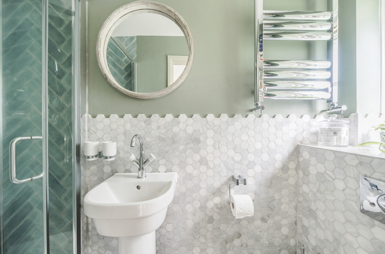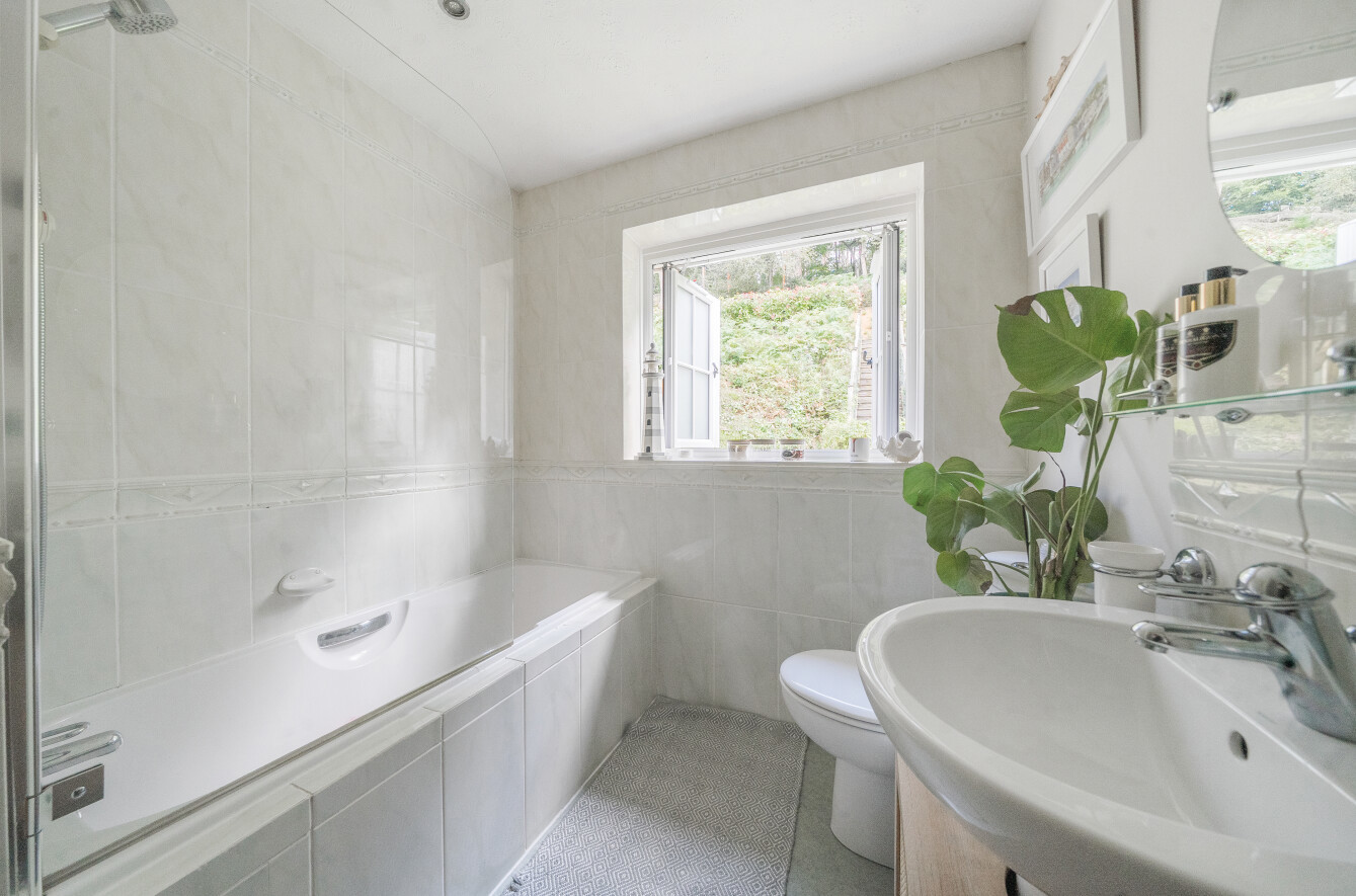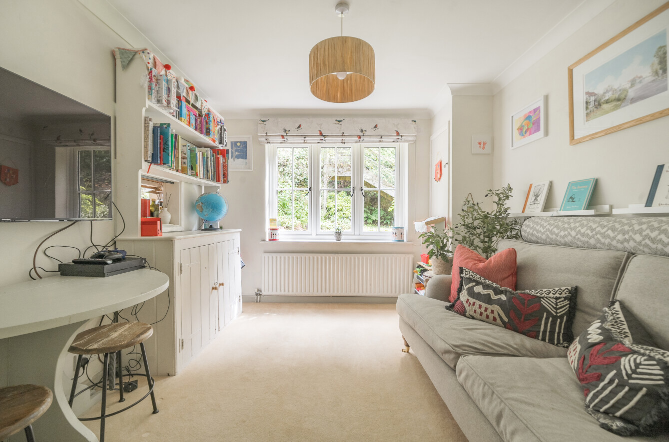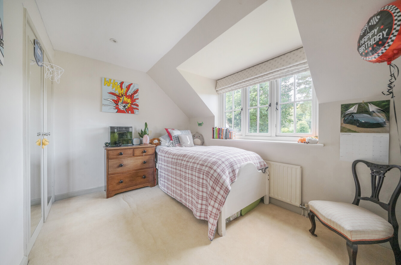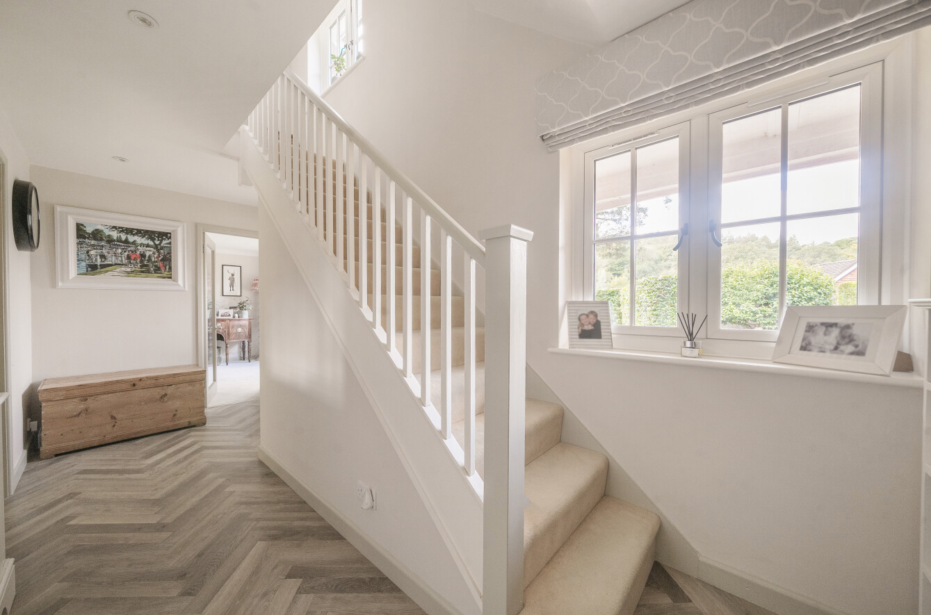 Upstairs, the master bedroom offers a peaceful retreat, complete with built-in wardrobe along with its own en-suite shower room for added comfort. The en-suite smartly finished with marble hexagon tile with contrasting herringbone tiles within the walk-in shower. Two further double bedrooms along with a charming study area, perfect for a home office or reading nook, leads through to the fourth bedroom, offering a unique layout that is ideal for growing families or those seeking separate spaces for work and relaxation. These three bedrooms are all well-proportioned, offering plenty of natural light and space. A family bathroom serves these bedrooms.
