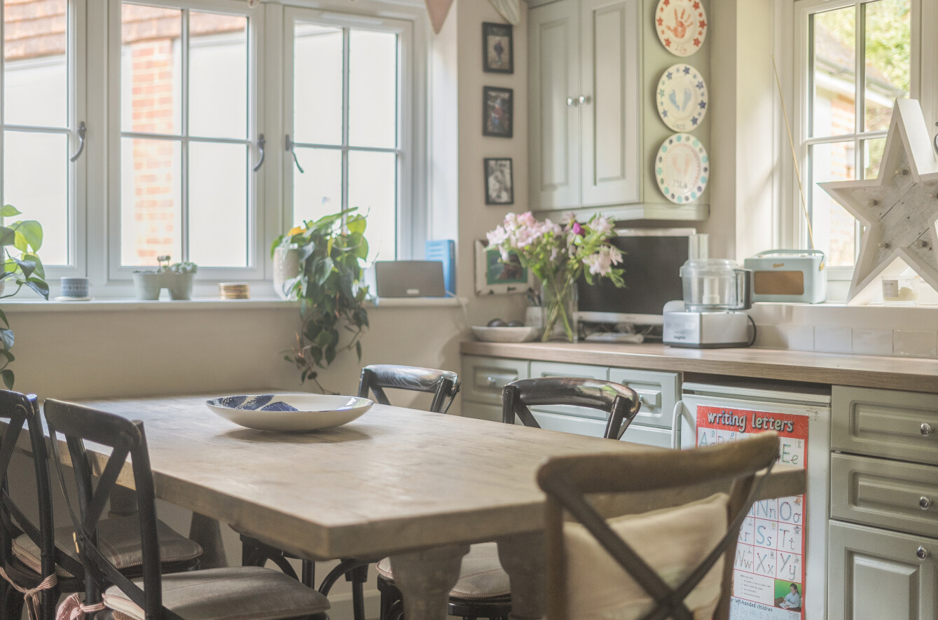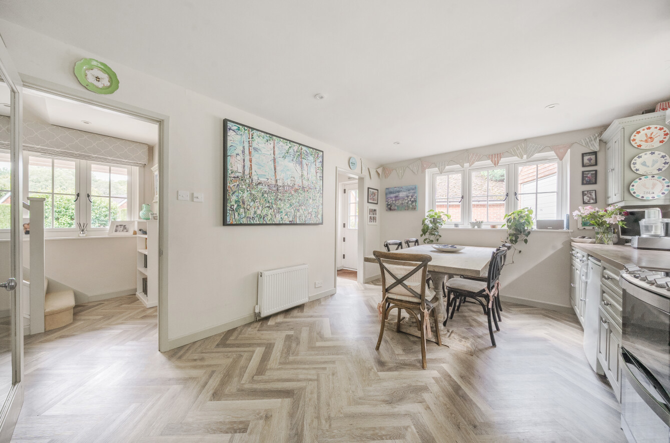 At the heart of the home is the spacious and well-appointed kitchen/breakfast room. With its elegant herringbone flooring, heritage-toned cabinetry, and ample space for dining, this room is ideal for everyday family meals or casual entertaining. The adjoining utility room provides additional storage and laundry space, helping to keep the main living areas uncluttered. A downstairs WC adds convenience for both family members and guests.