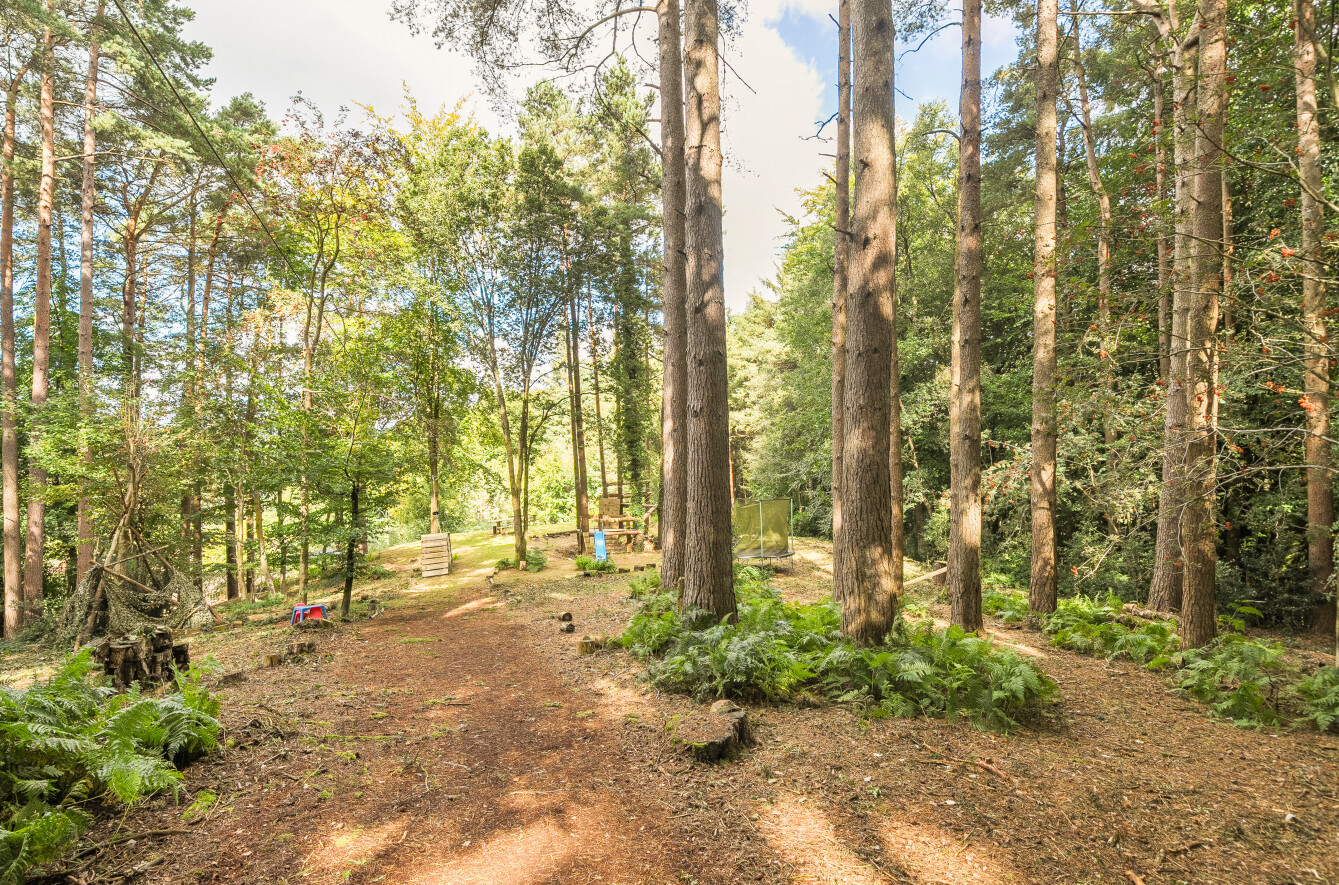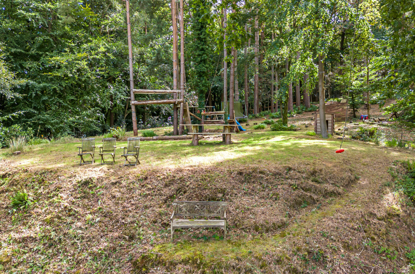Outside, the rear garden has been thoughtfully landscaped and levelled, creating a beautiful and practical space for outdoor entertaining and al fresco dining. This expansive garden offers plenty of space for children to play and for adults to relax, with steps leading up to the property's crowning jewelapproximately 1.5 acres of private woodland. Here, you'll find an engaging area for children and adults alike, complete with a zipline and a fire pit area that creates a magical setting for evenings spent under the stars. The woodland truly adds a unique dimension to the home, offering endless opportunities for exploration, play, and relaxation.
