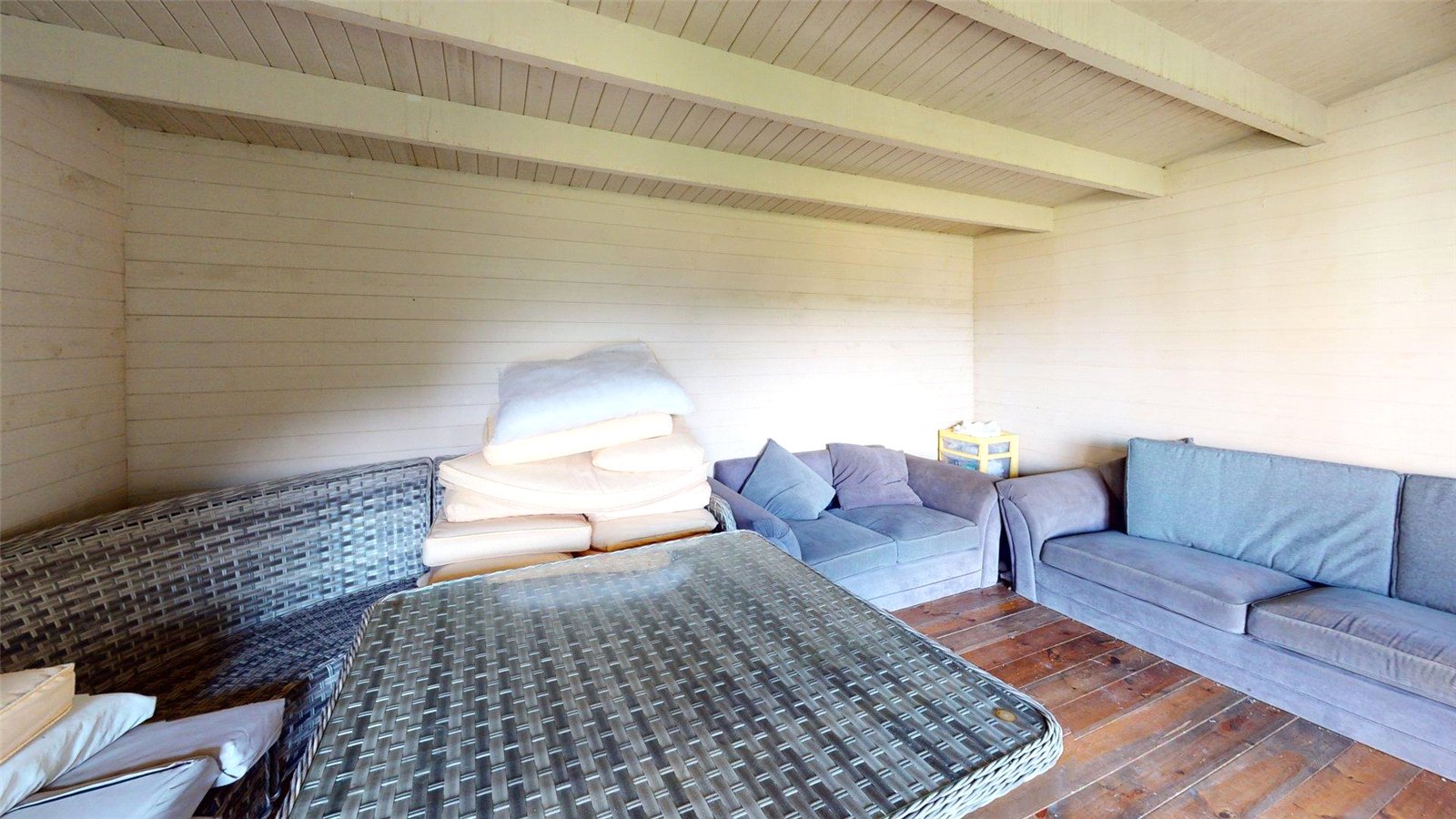 Positioned within a secluded corner of the grounds and benefiting from a small patio space for outdoor seating, this garden house adds valuable versatility to the property — ideal for year-round use or as a quiet escape in nature.
