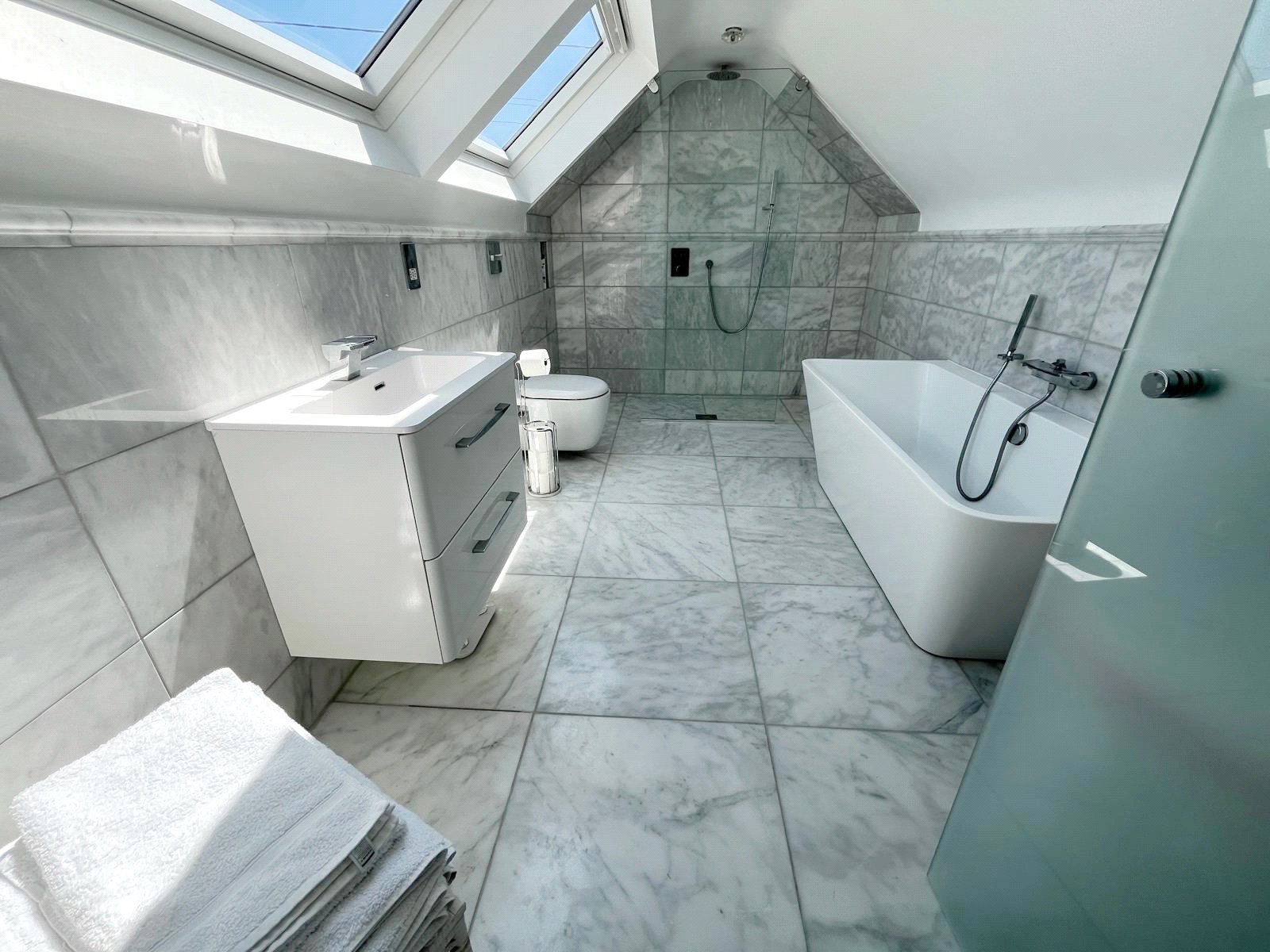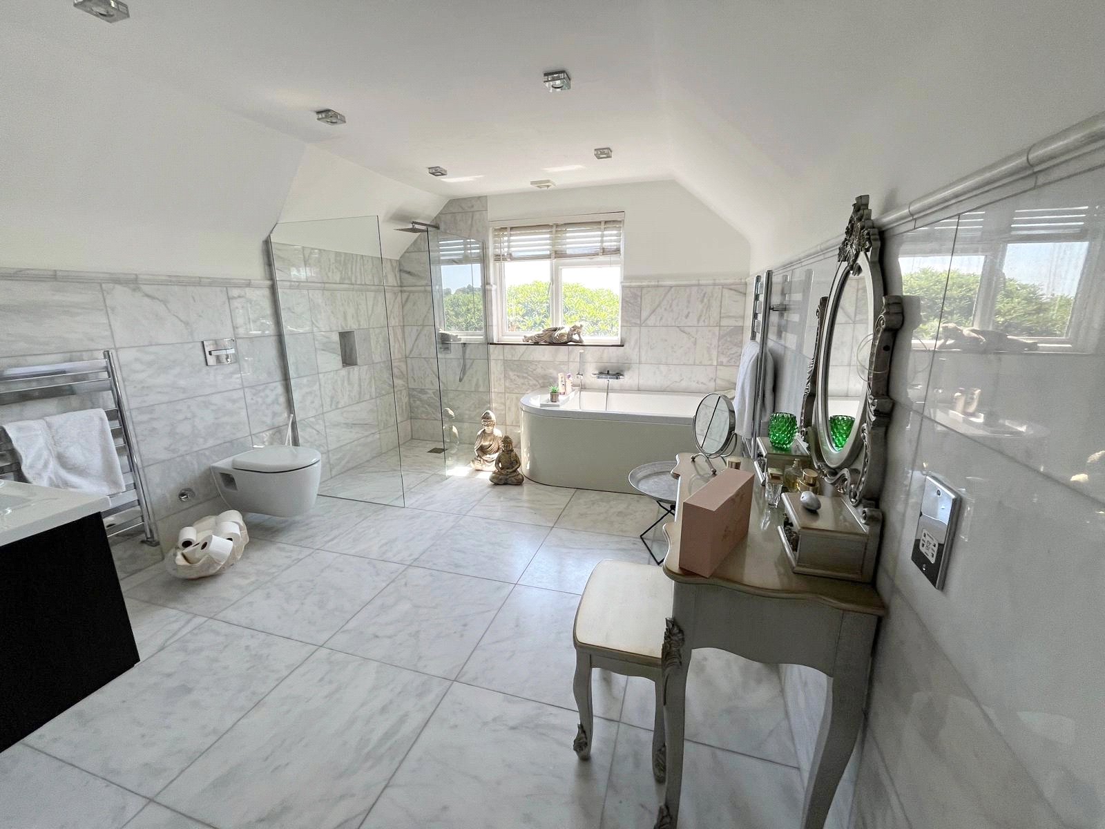 Fully tiled in elegant grey-veined white marble, the suite comprises a freestanding contemporary bathtub, a sleek wall-mounted vanity unit with chrome fixtures, a concealed cistern WC, and a generous walk-in rainfall shower with glass screen and recessed controls. The clean lines, premium materials, and thoughtful lighting combine to deliver a luxurious, spa-like experience in the comfort of your own home.