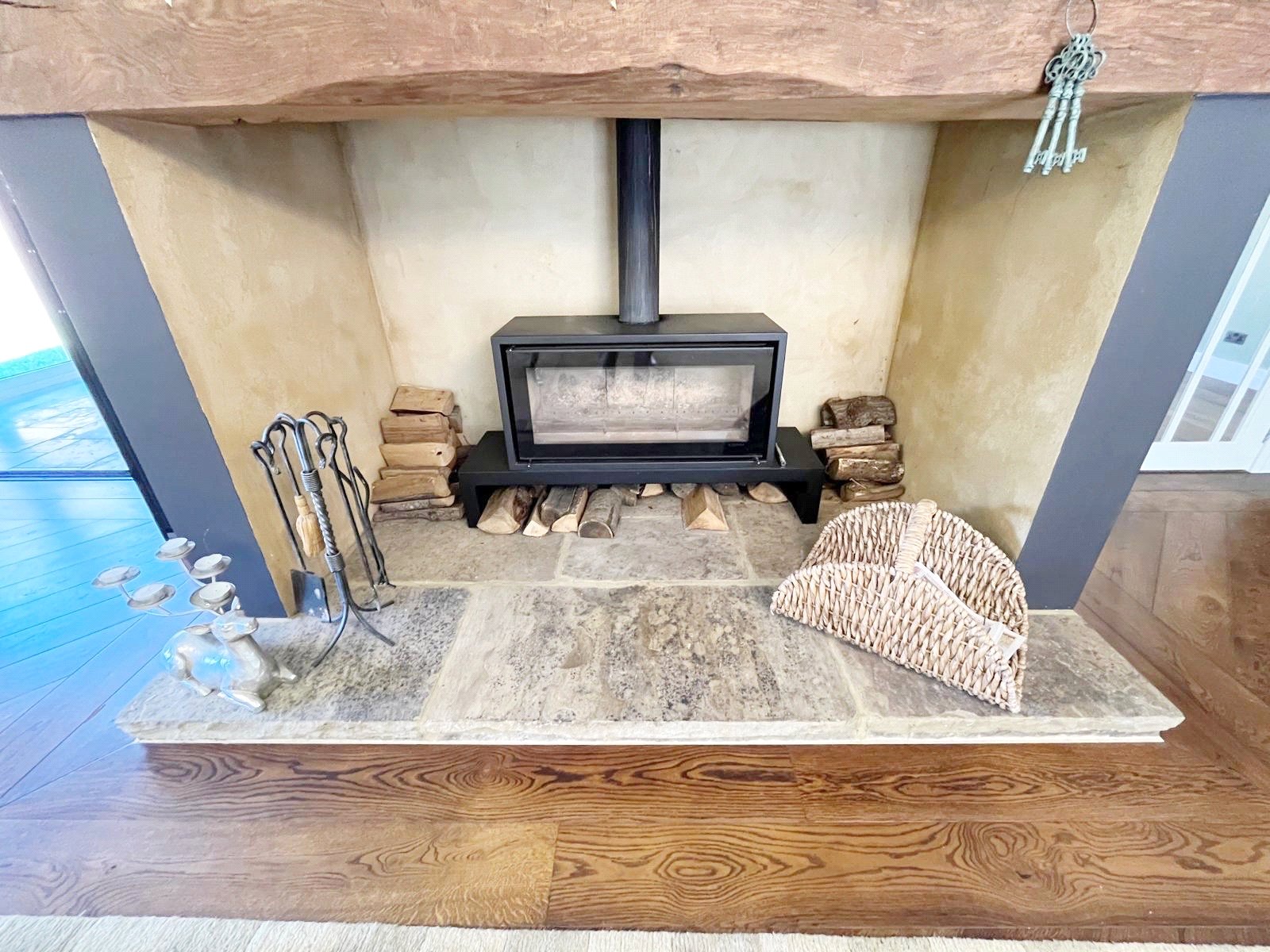 LIVING ROOM: An impressively proportioned and tastefully styled principal reception room, offering a sophisticated yet inviting space ideal for both relaxation and entertaining. The room is centred around a striking inglenook-style fireplace with a solid timber beam and a contemporary log-burning stove set on a stone hearth — a perfect focal point for cosy evenings in.
