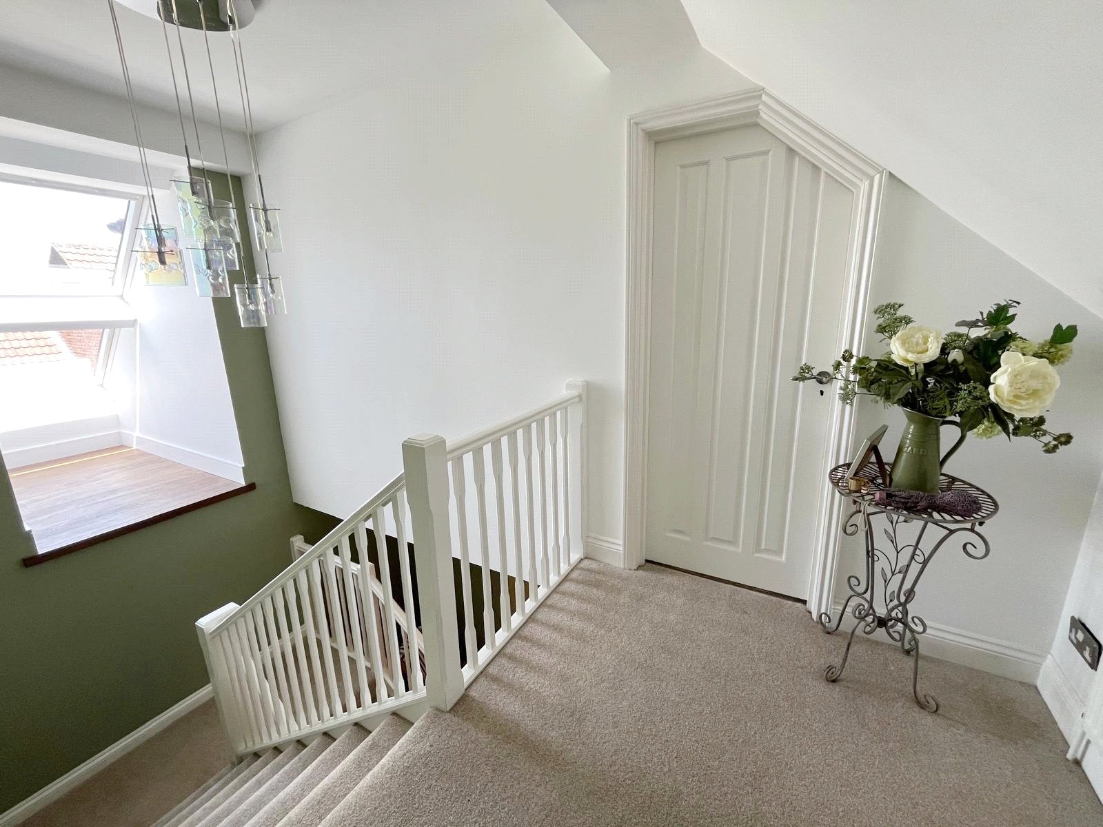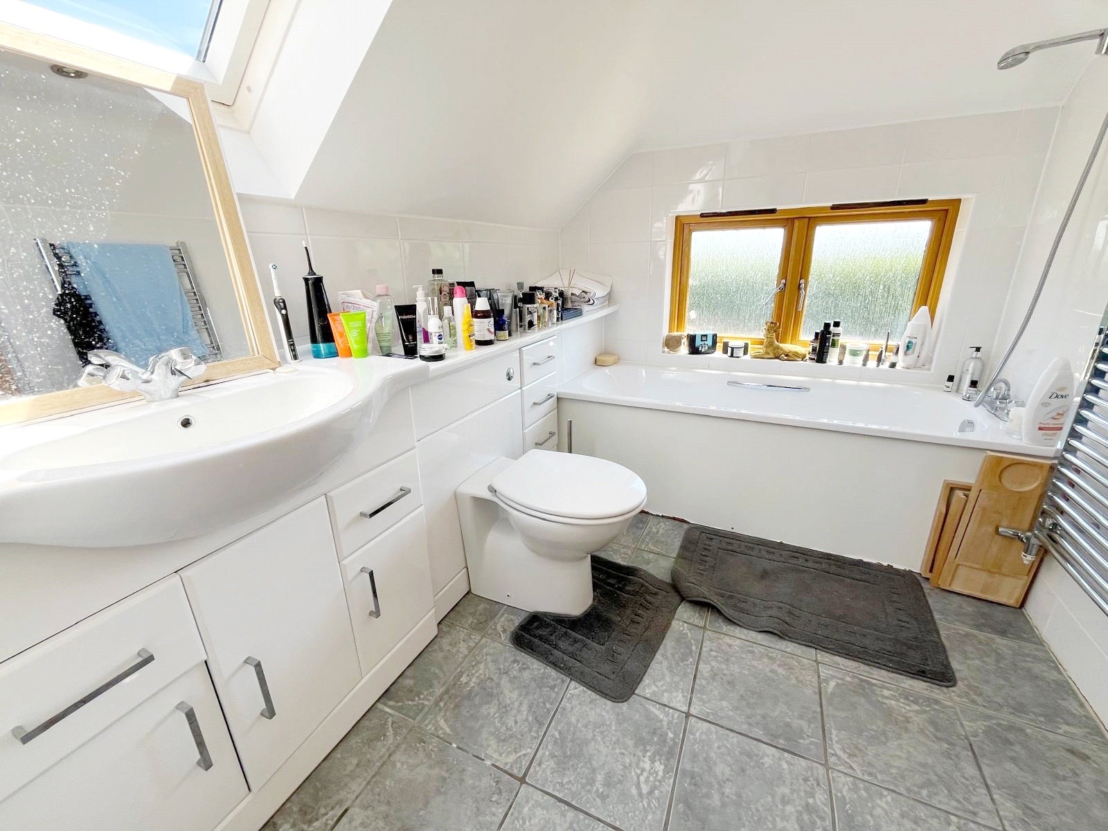 ANNEXE BEDROOM:Upstairs, a spacious double bedroom features dual aspect windows, fitted carpet, and eaves storage, while the contemporary bathroom is fully tiled and fitted with a white suite including a panelled bath with overhead shower, vanity unit, and WC. With its own entrance, staircase, and well-defined living zones, the annexe provides a comfortable and independent living space within the main residence.
