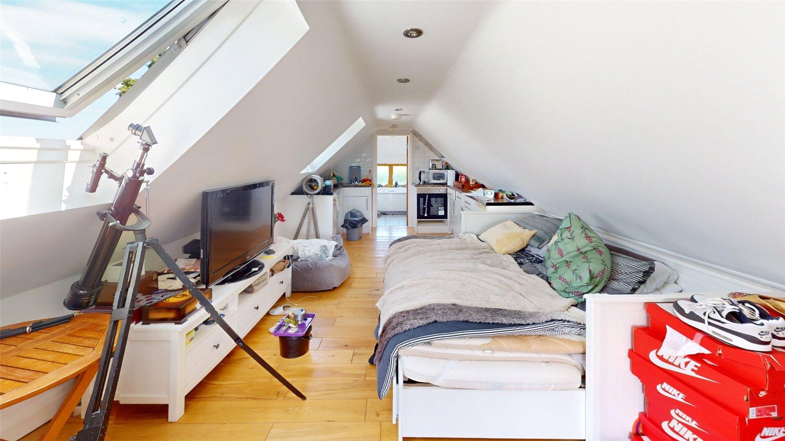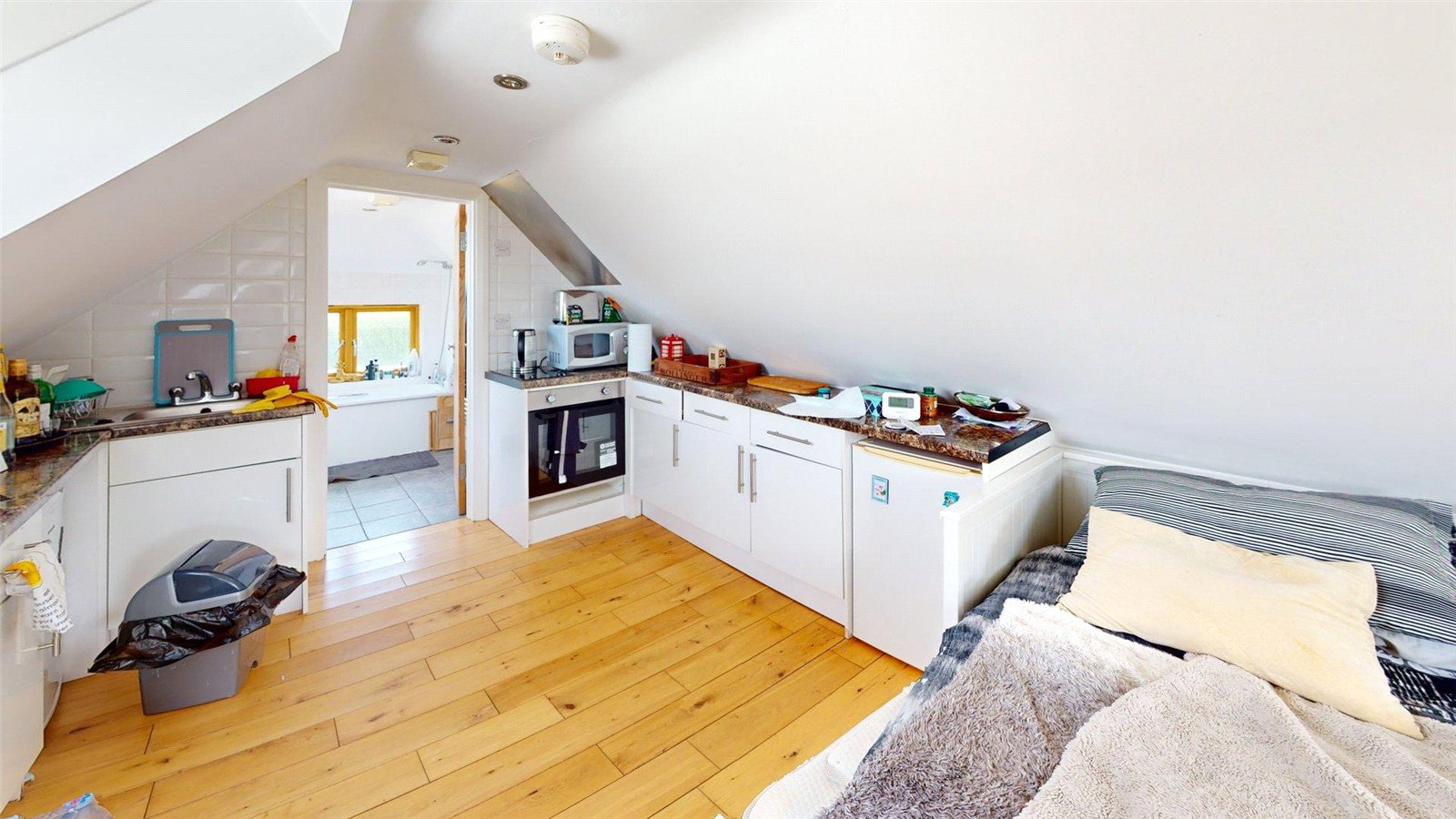 Accessed via a private staircase, the open-plan layout maximises space under the eaves and is flooded with natural light from multiple skylights. The accommodation features a sleeping and living area, with fitted storage and ample room for a desk or seating. A modern kitchen is fitted with sleek units, an integrated oven, electric hob, and under-counter fridge, while the adjacent bathroom is smartly tiled and offers a full-sized bath with shower attachment.