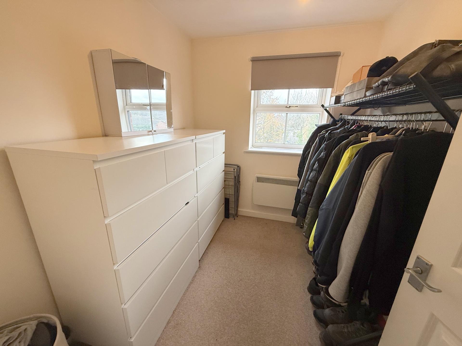 Wood effect flooring, storage cupboard housing hot water cylinder, wall mounted consumer unit, doors to lounge, bathroom & bedrooms.