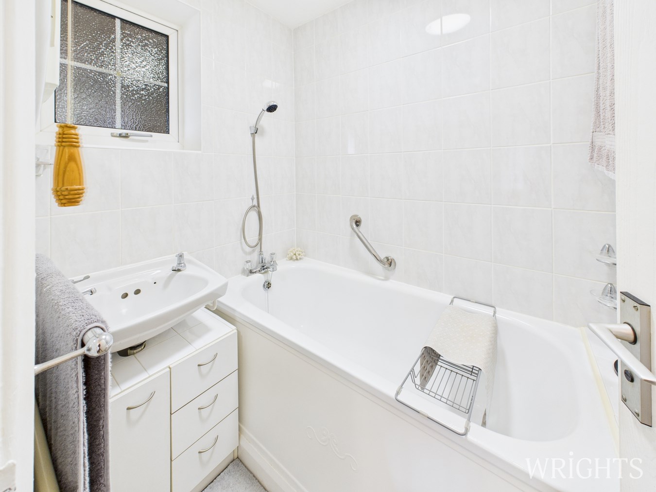 Side aspect double glazed frosted glass window. Panel enclosed bath with hand held shower attachment over, wash hand basin, fitted radiator, fully tiled walls.