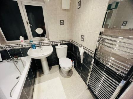 Side aspect double glazed frosted glass window. Three piece bathroom suite comprising of a panel enclosed bath with hand held shower attachment. Pedestal wash hand basin, low level WC, Heated towel rail, Fully tiled walls.