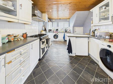 10' 6" x 18' 1" (3.20m x 5.51m) Front aspect double glazed windows. Range of matching wall and base units with worktops over, space for appliances, integrated dishwasher, Cooker canopy, complementary tiling to splashback areas, breakfast bar, understairs storage cupboard, wall mounted "Combi" boiler, fitted radiator, double glazed door to side.