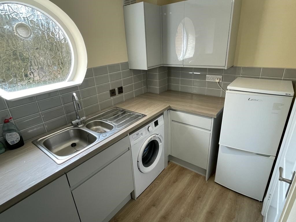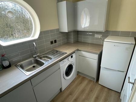 1.72m x 3.03m (5' 8" x 9' 11") Fitted kitchen comprises a range of matching base and wall units, stainless stell sink with drainer, integrated oven with electric hob above and space and plumbing for a washing machine and fridge freezer.