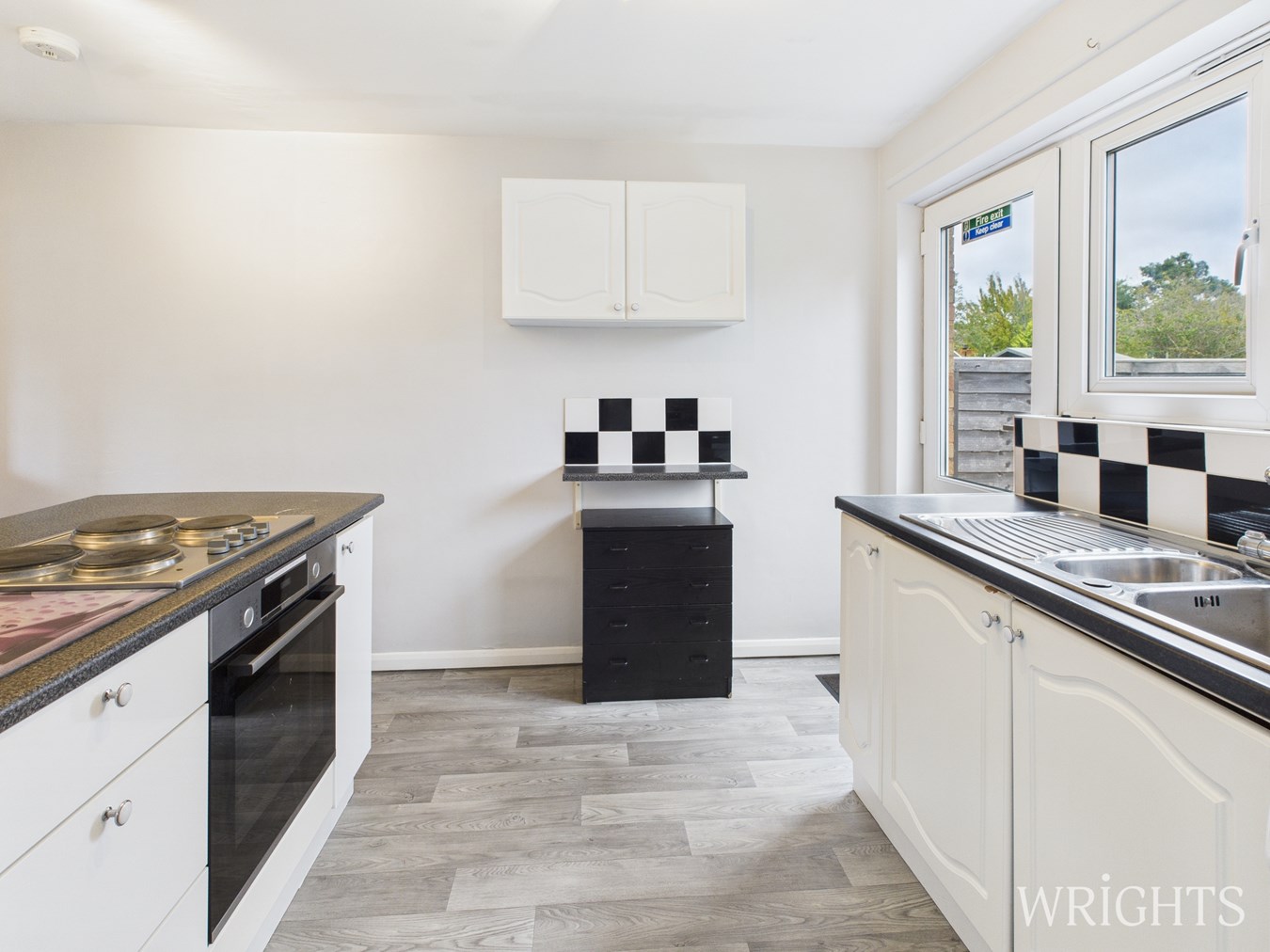 2.92m x 3.85m (9' 7" x 12' 8") Fitted kitchen with numerous cupboards and work surface space. Fitted items include an electric oven, electric hob while there is space and plumbing for a washing machine and fridge freezer. Also benefits from additional storage cupboard. Vinyl flooring, gas radiator and double glazed window and door leading out to the garden.
