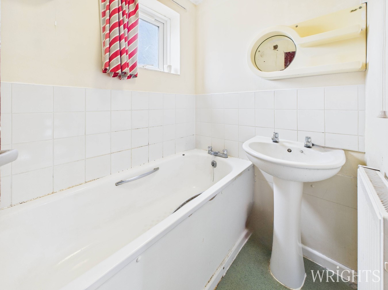 1.35m x 1.66m (4' 5" x 5' 5") Partially tiled with a side panelled bath and pedestal hand wash basin. Frosted UPVC window and radiator.